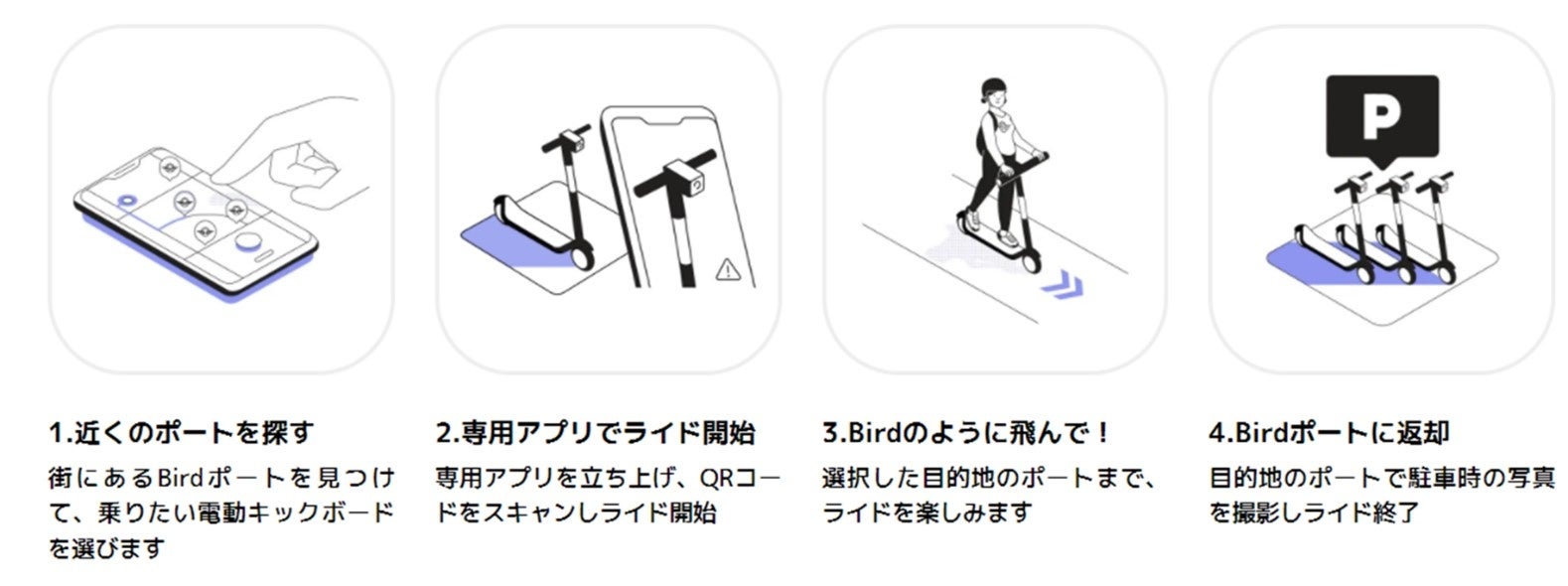 スマートフォンアプリ「Bird」をダウンロード後、会員登録、免許証登録、交通確認テスト等、アプリ内⼿順に従い登録完了後、以下⼿順にて利⽤(1分10円 ※実証実験期間特別料⾦)