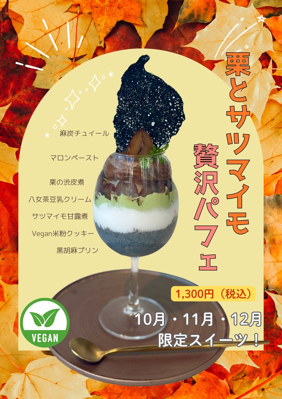 ざっくりな説明にはなりますが、底から黒胡麻プリン、Vegan米粉クッキー、さつまいも甘露煮、八女茶豆乳クリーム、栗の渋皮煮、更にマロンペースト!備え付けに麻炭チュイールを添えて秋らしさを表現しとっても豪華です^^ ※別途追加料金にてトッピング(自家製あんこ・白玉団子)もございます