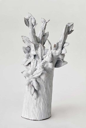 アーティチョーク、風変わりな蝶、そしてマルメロはサラダボウルの底に鎮座し、タチアオイは花瓶をよじ登り、ボートはカップの上を航行します。ジョン・デリアンの世界はいかにも楽しげに、白い陶器に宿り続けます。