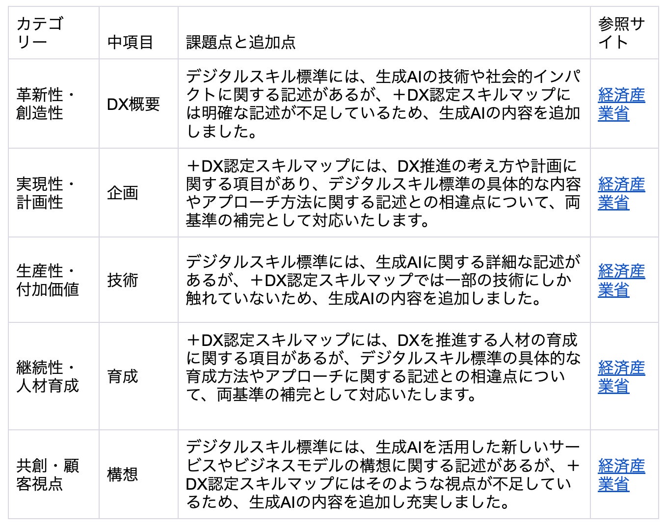 デジタルスキル標準には、生成AIの技術や社会的インパクトに関する記述があるが、+DX認定スキルマップには明確な記述が不足しているため、生成AIの内容を追加しました。