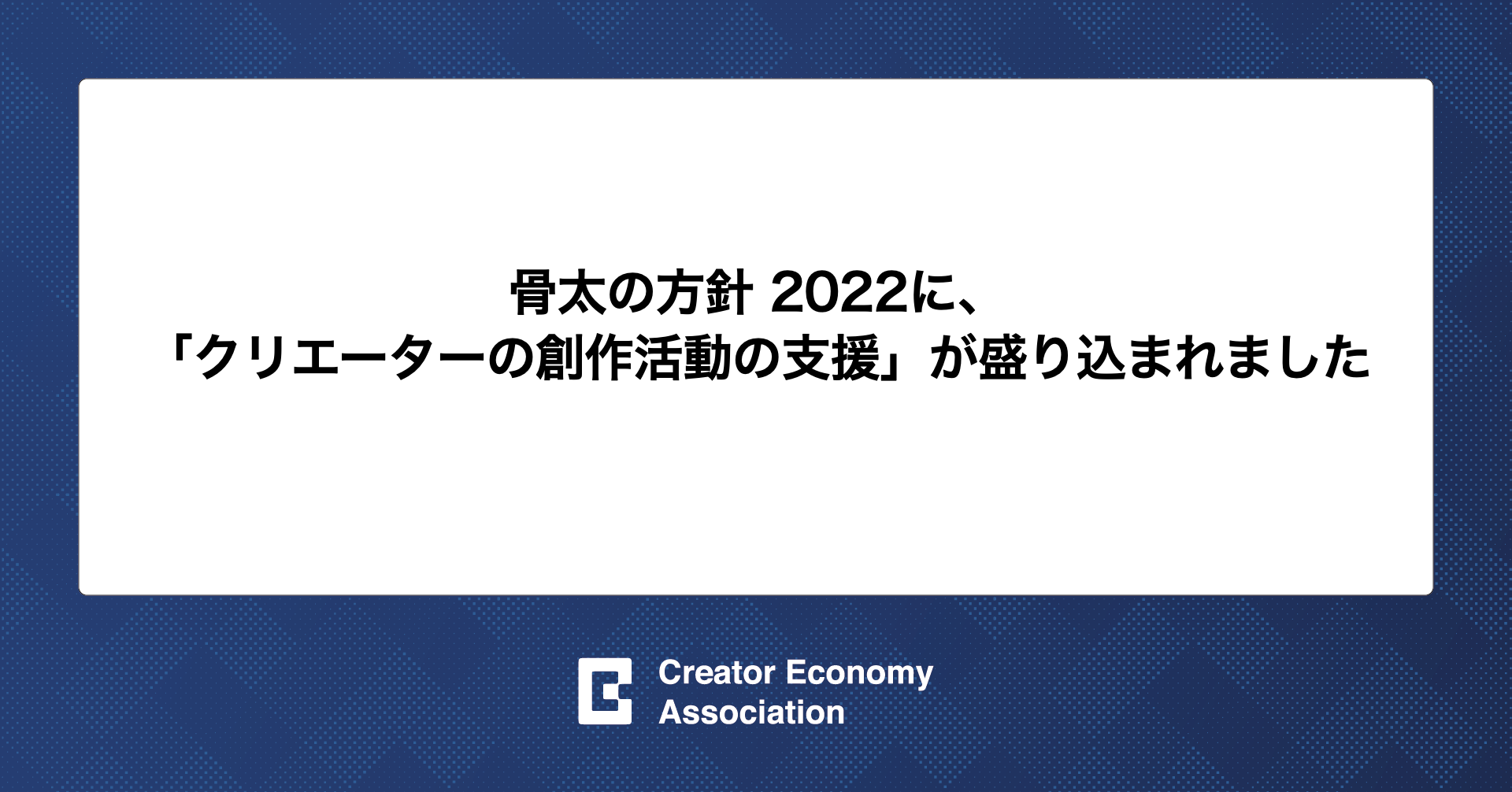 一般社団法人クリエイターエコノミー協会(以下、当協会)は、2022年6月7日に政府が閣議決定した、経済財政運営と改革の基本方針 2022(通称:骨太の方針)に、「クリエーターの創作活動の支援」が盛り込まれたことをお知らせします。