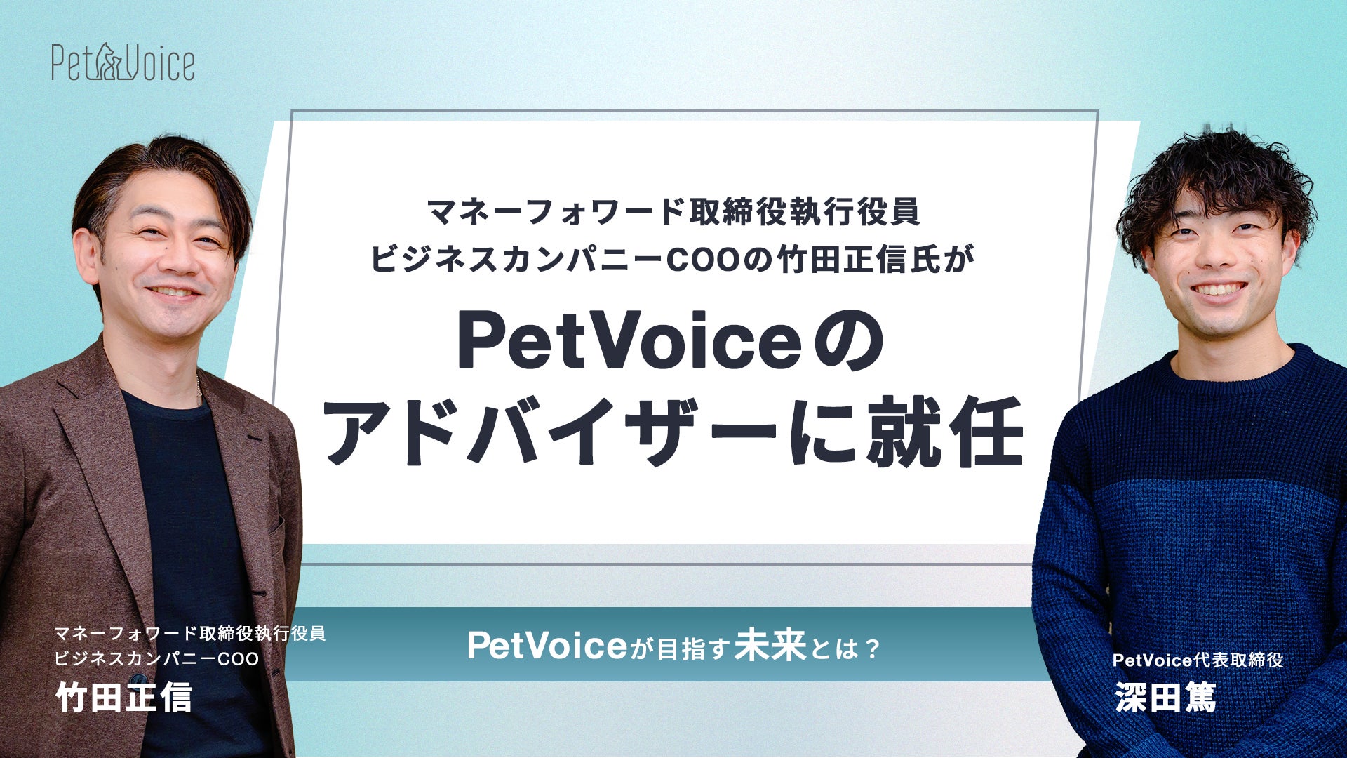 このたび、PetVoiceは、約20年間にわたる複数のスタートアップでの経験と知見を有し、現在はマネーフォワードのSaaS事業のCOOとして、同社の事業成長を手掛けているマネーフォワード取締役執行役員の竹田氏にアドバイザーに就任いただくことになりました。PetVoiceの中長期的な経営戦略や、パートナーである動物病院との連携強化に関する助言等、さまざまな面でPetVoiceの経営支援に関わっていただきたいと考えております。