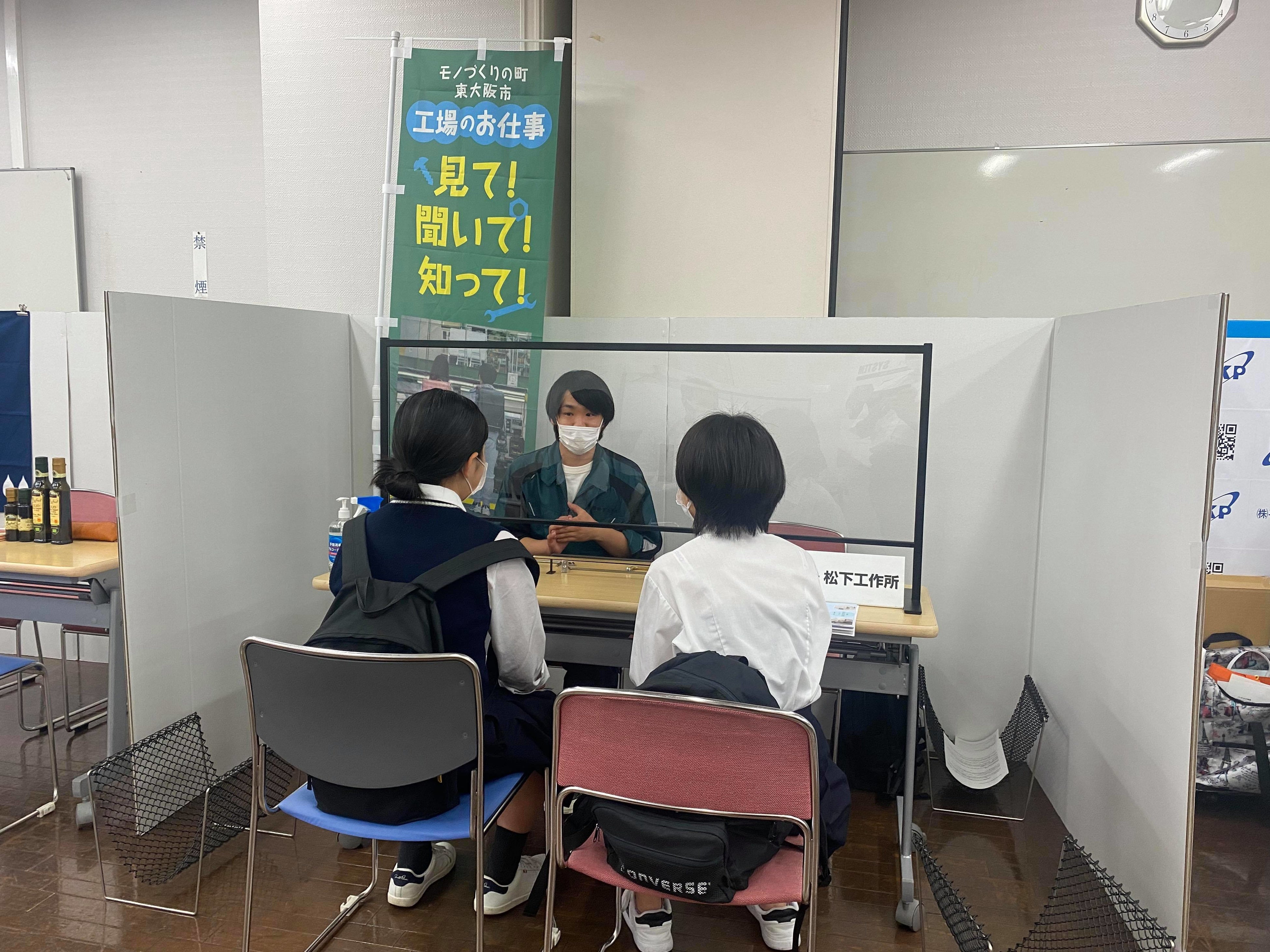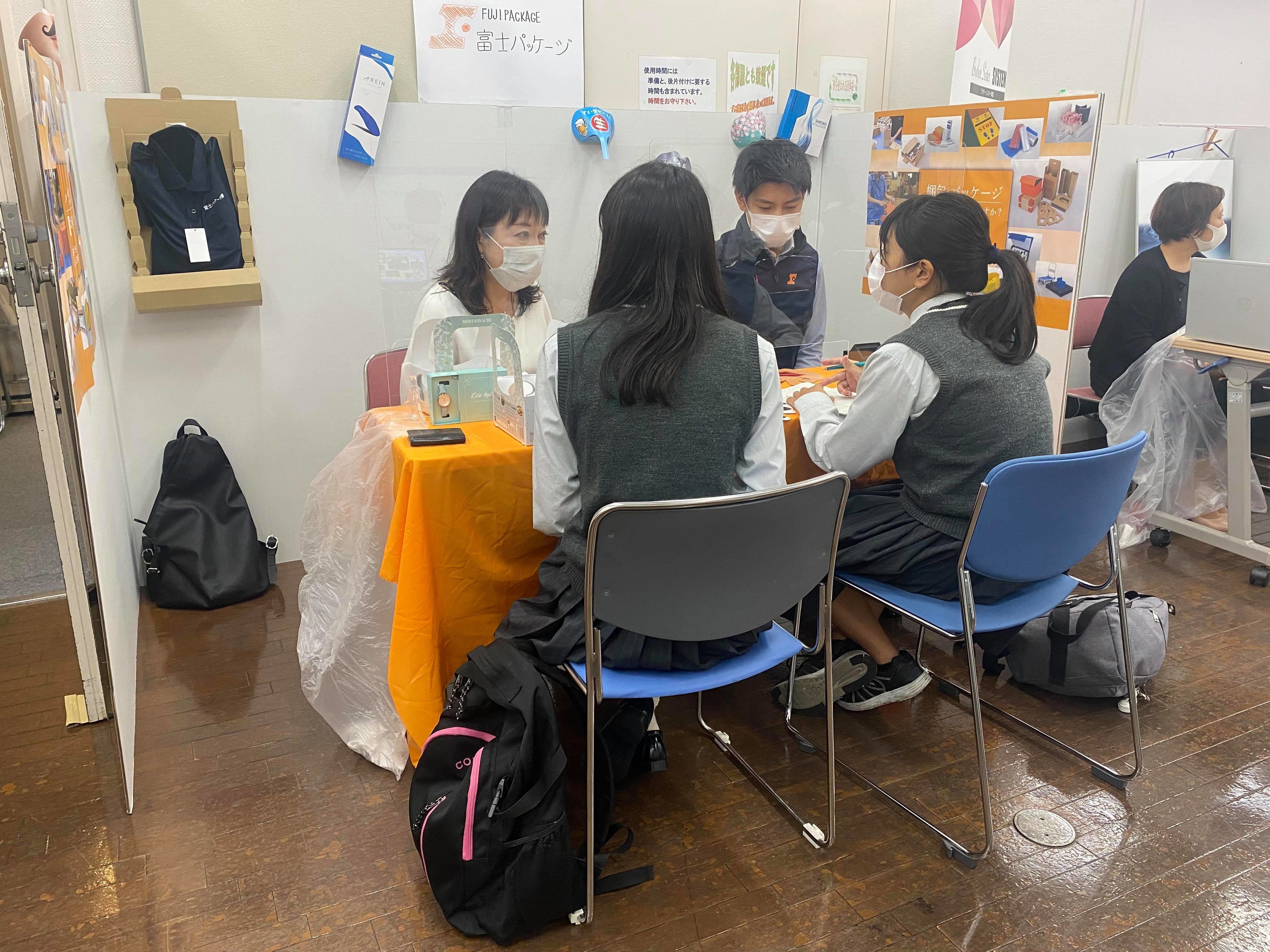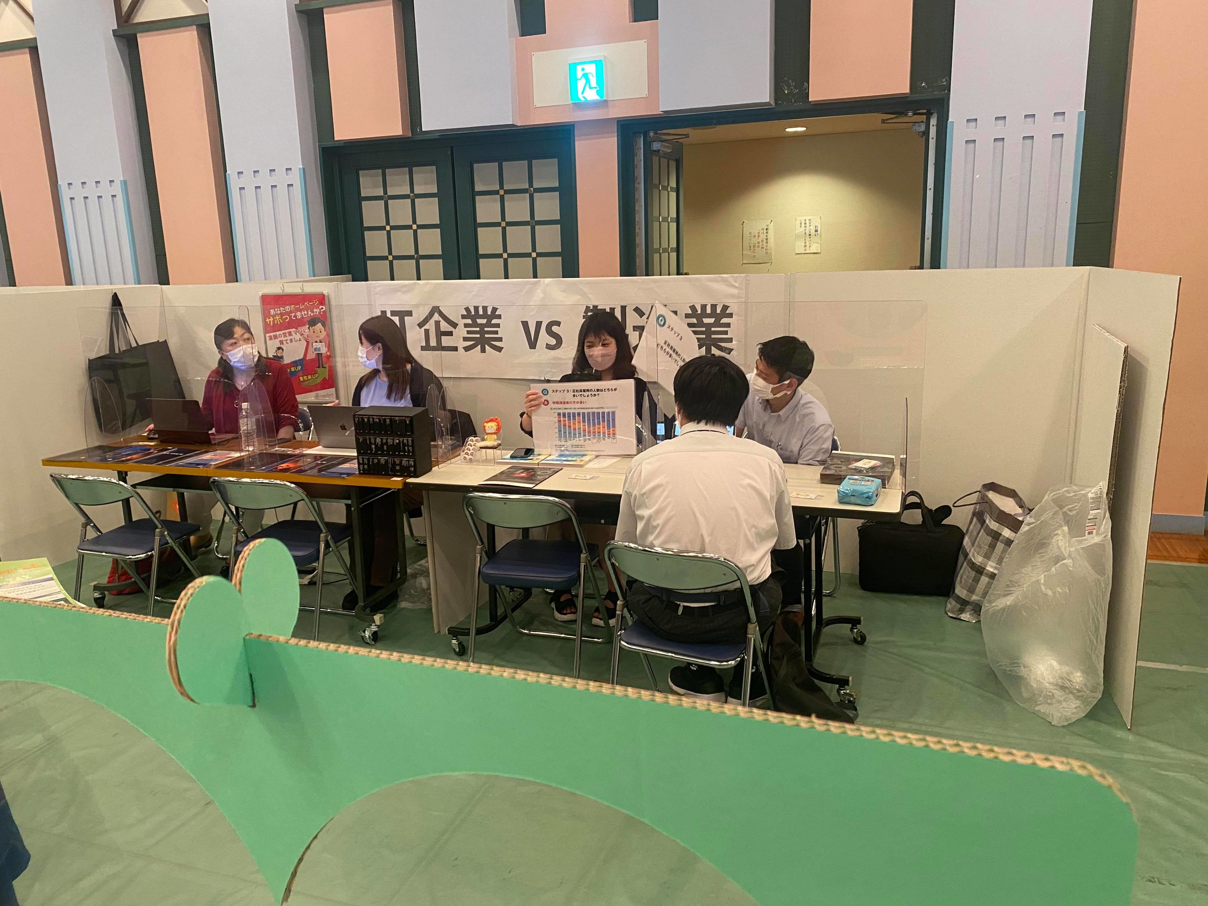 会場では個別にテーブルを設置し、各企業がパンフレットや⾃社の製品を⼿に各社の魅⼒を対話形式で⽣徒に伝えます。