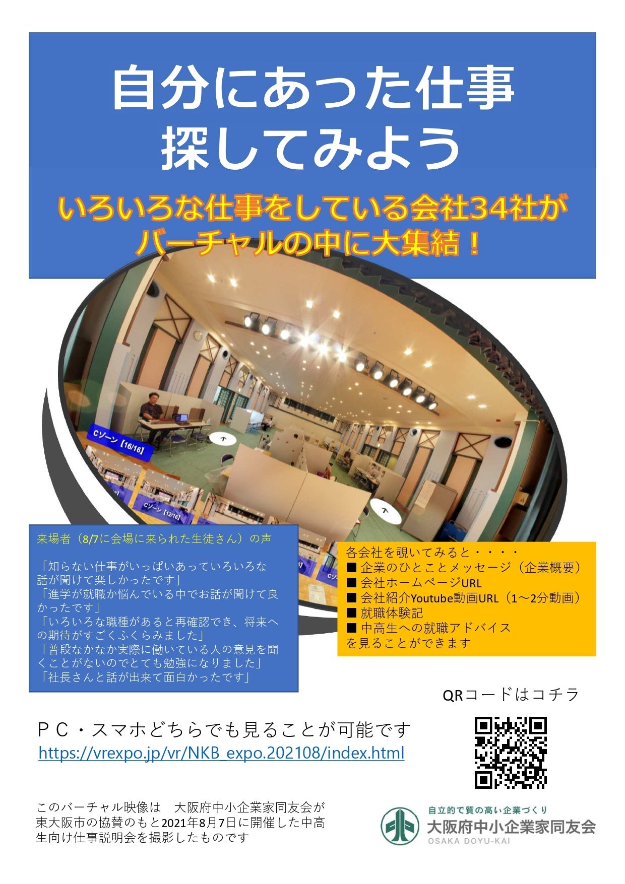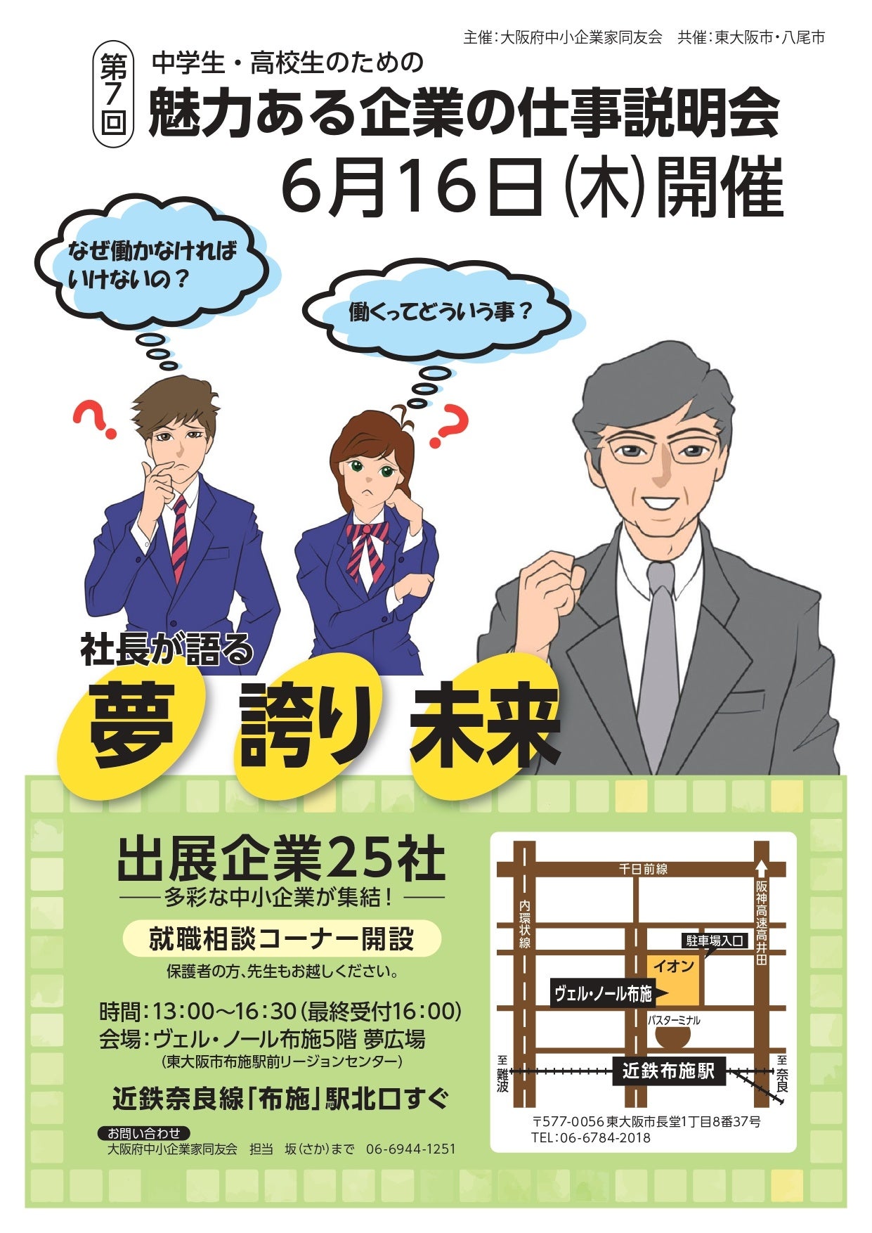 《⼤阪府中⼩企業家同友会は中学⽣・⾼校⽣のための「仕事説明会」を6⽉16⽇(木)にヴェル・ノール布施5階夢広場にて開催》