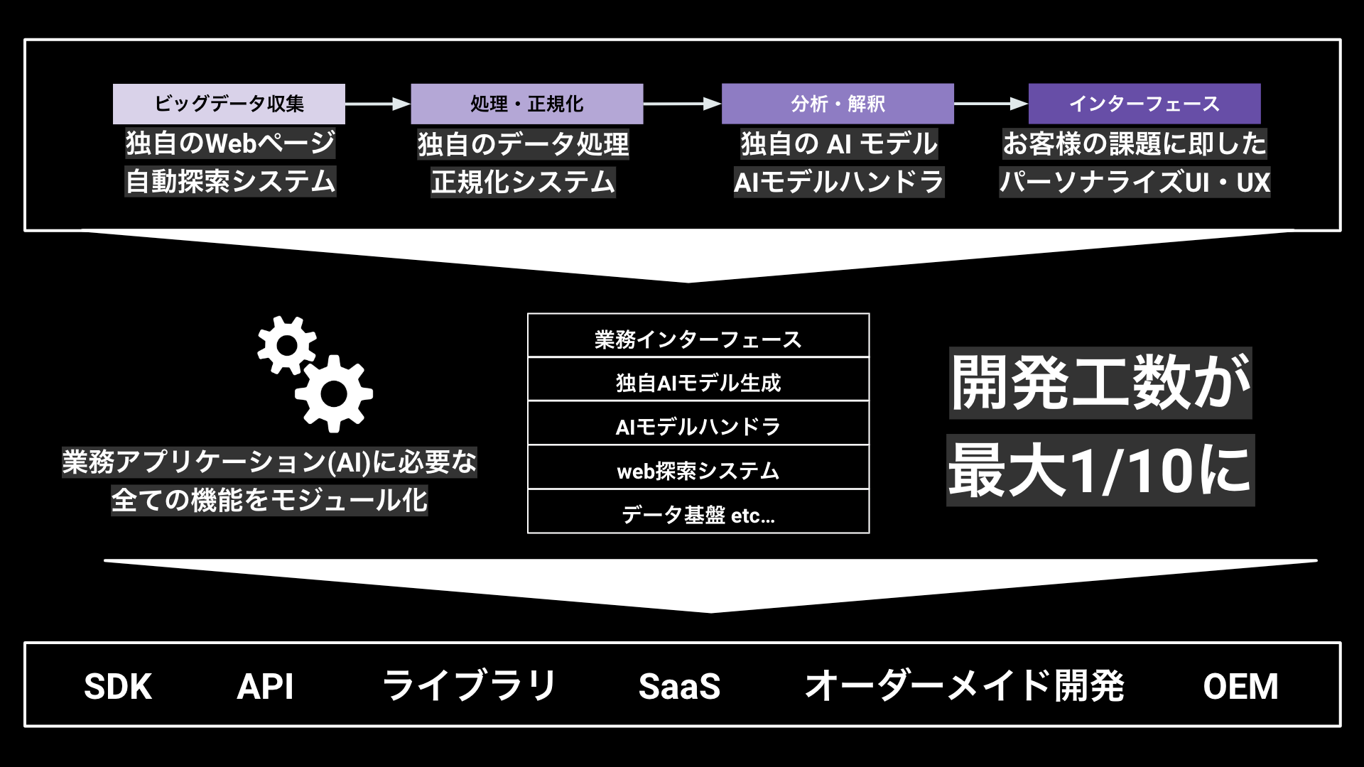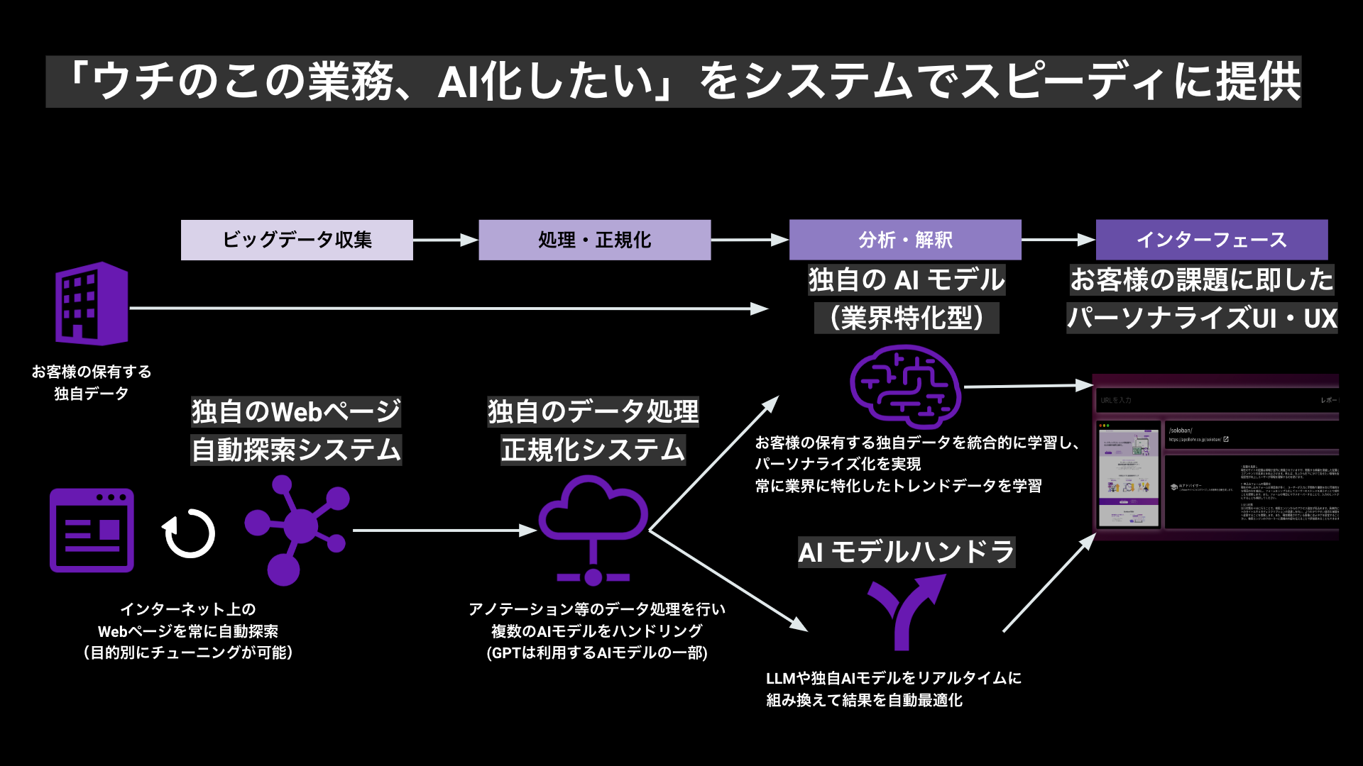 さらに新技術が登場した場合でも柔軟にシステムに組み込むことができ、また貴社の社内データと連携させることで、貴社の課題解決に直結するAIシステムの構築が可能となります。