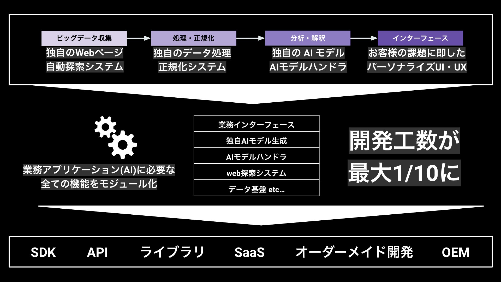 『+AI Studio』はモジュール化された当社独自のAI技術を基に、貴社の課題解決に直結する独自のシステムを品質高くスピーディーに構築いたします。