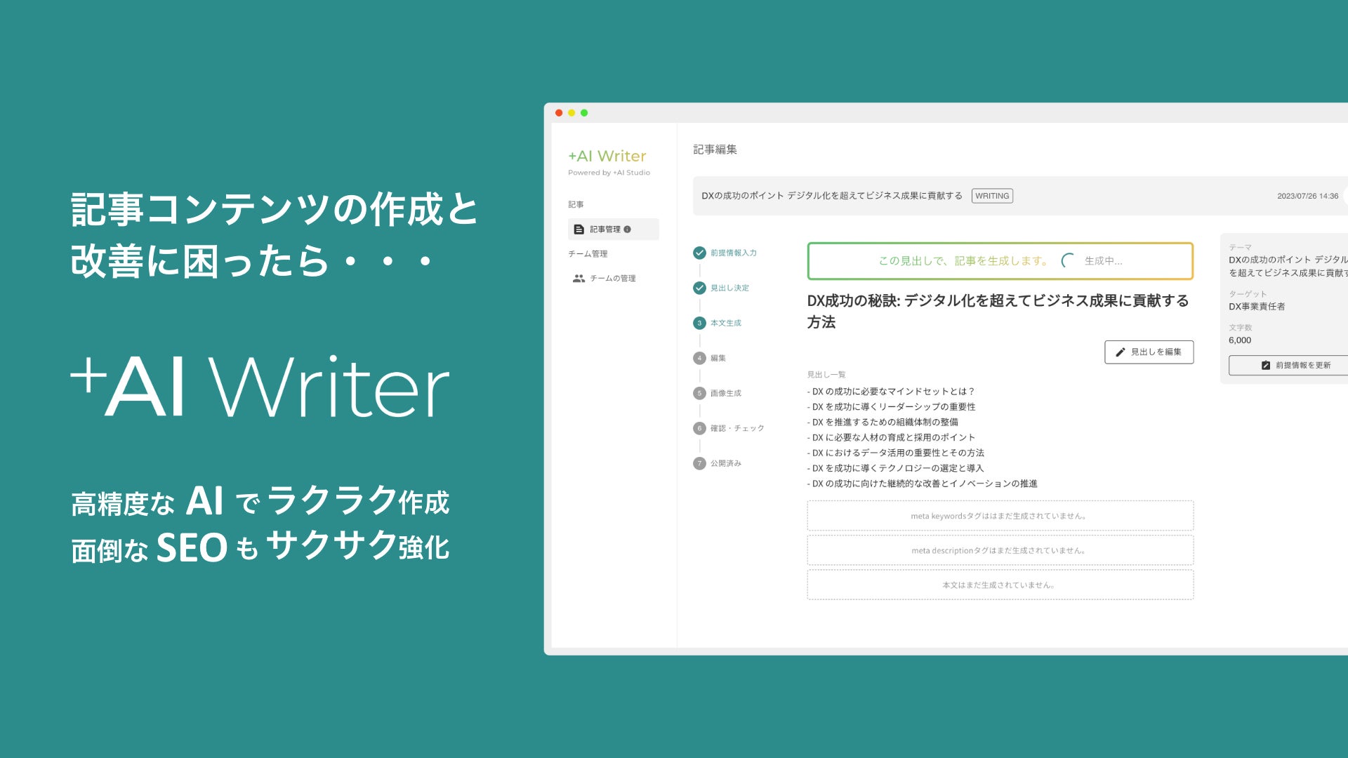 「+AI Writer」は、Webメディアの運営または記事制作・運用代行されている企業様向けに提供している、記事コンテンツの制作と運用を効率化するツールです。