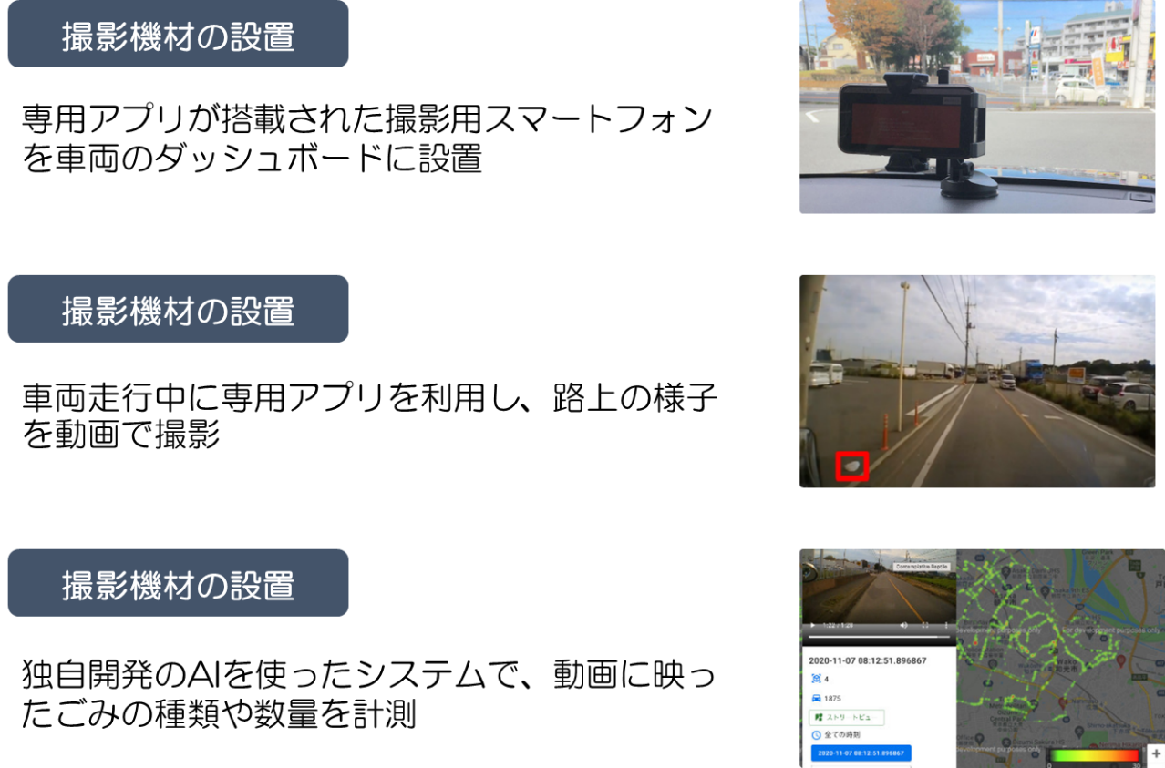 専用アプリが搭載された撮影機材を車両に取り付けることで、業務走行中に道路のごみの分布状況を調査することが可能になりました。