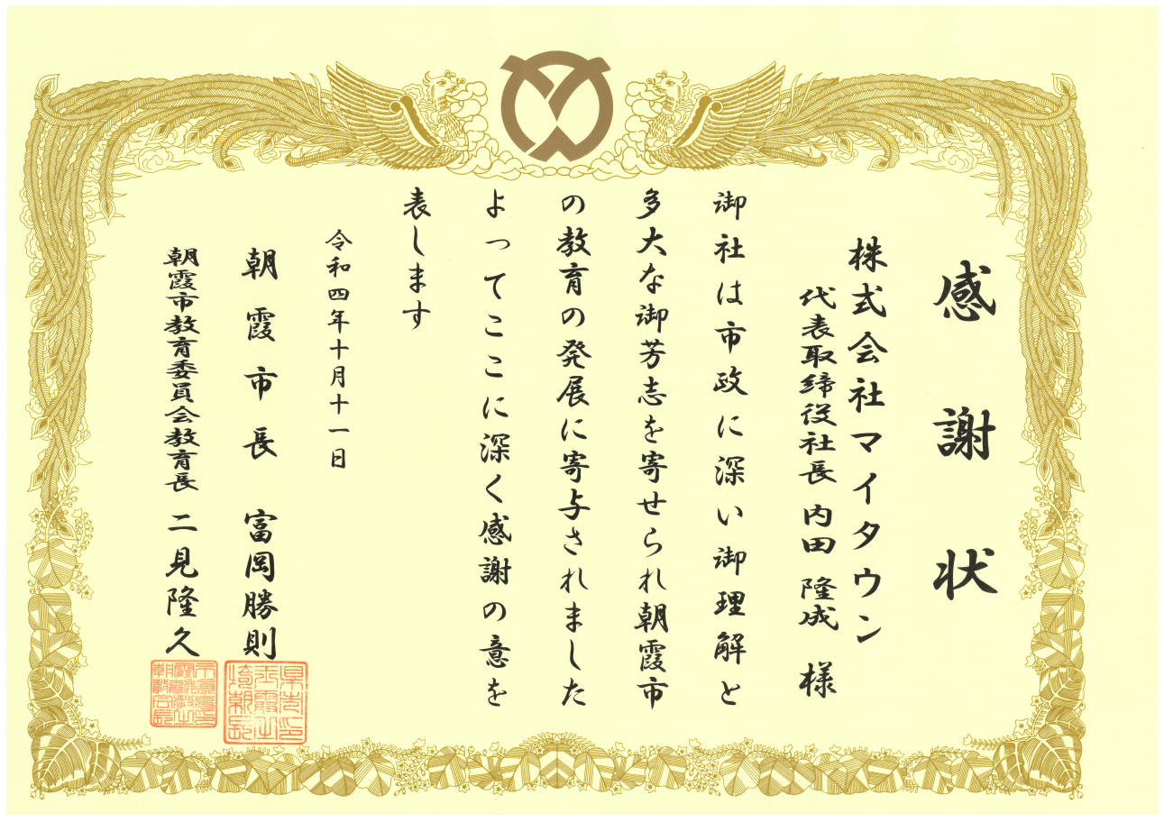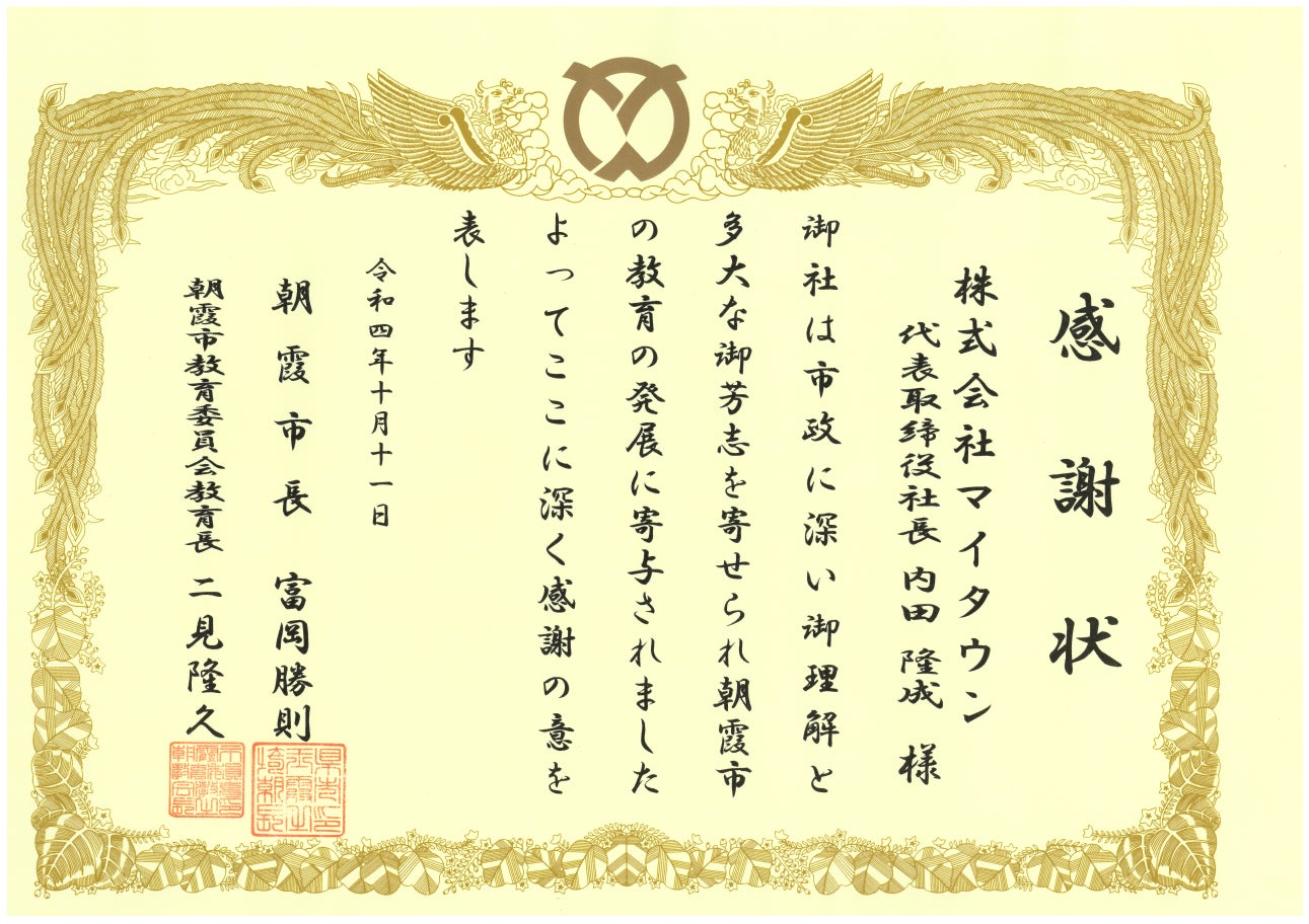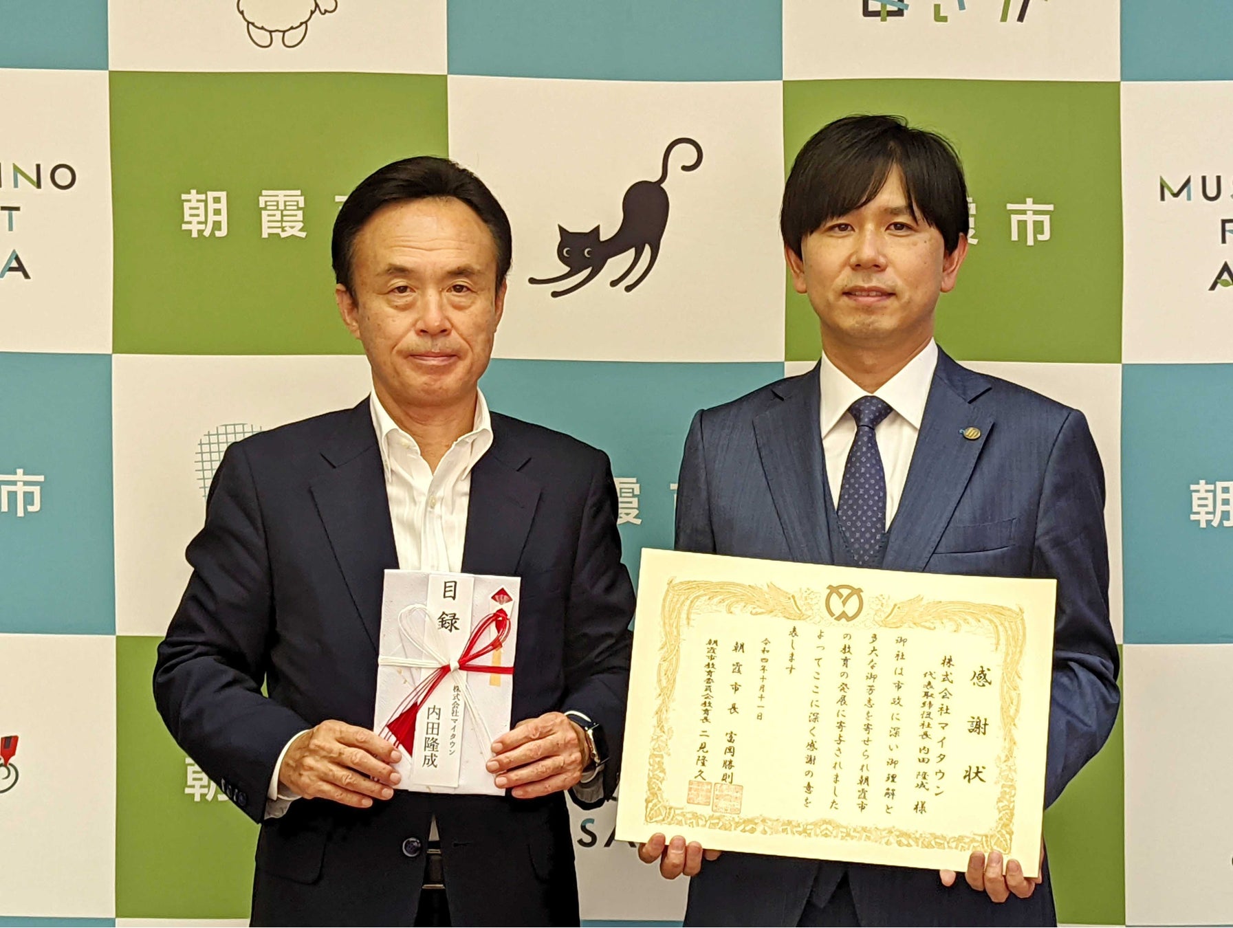 2022年10月11日(火)、朝霞市の教育発展に役立てていただくため、株式会社マイタウン(以下、「当社」)は朝霞市への寄付を行いました。