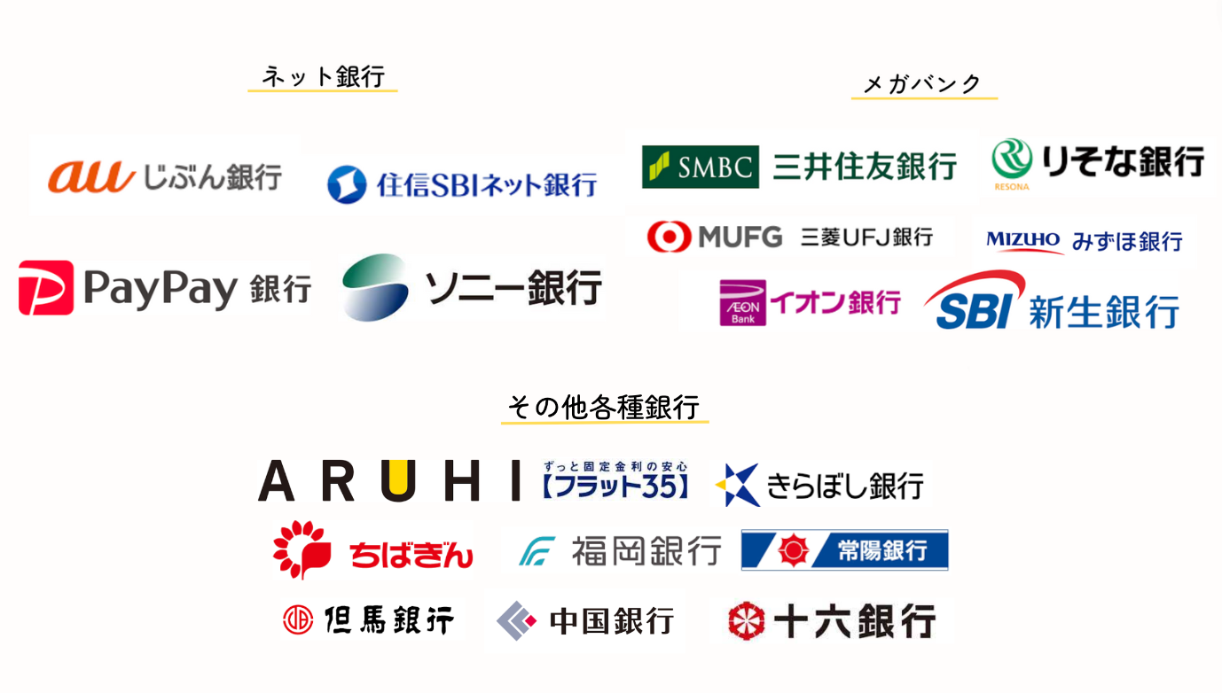 全国の主要銀行やネット銀行だけでなく、お客様が対面にて手続きをご希望の場合には、対面にて対応できる銀行も提供しております。