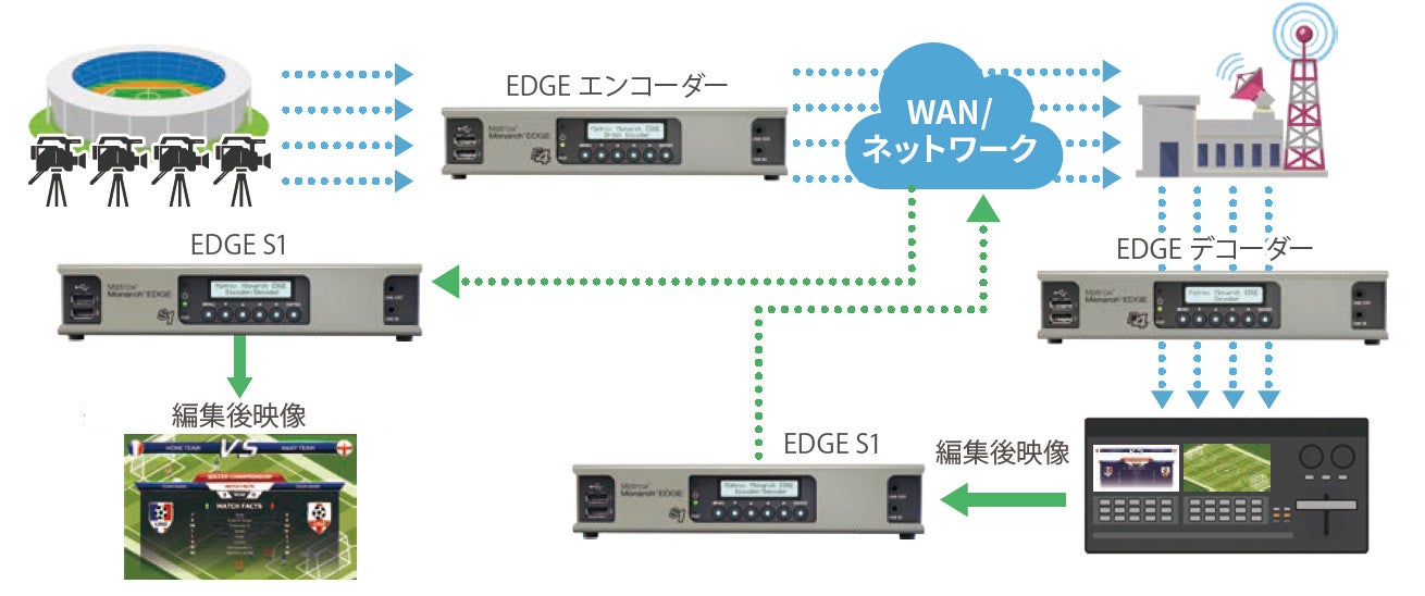 「Monarch EDGE」シリーズの「Monarch EDGEエンコーダー」および「デコーダー」と本製品を組み合わせることで、リモートプロダクションでの活躍の幅がさらに広がります。中継現場から4台のSDIカメラ映像を「Monarch EDGEエンコーダー」によりインターネット経由でスタジオに配信。この映像をスタジオ側の「Monarch EDGEデコーダー」でプロダクションシステムに入力し、リモートプロダクションを実行します。編集後の映像を「Monarch EDGE S1」に入力し、リターンチャンネルとして中継現場にある「Monarch EDGE S1」へ配信してデコードすることで、中継現場スタッフが確認できます。