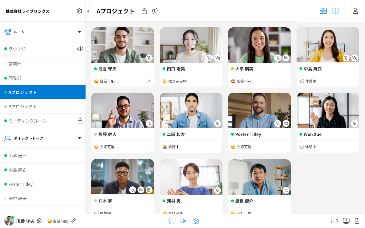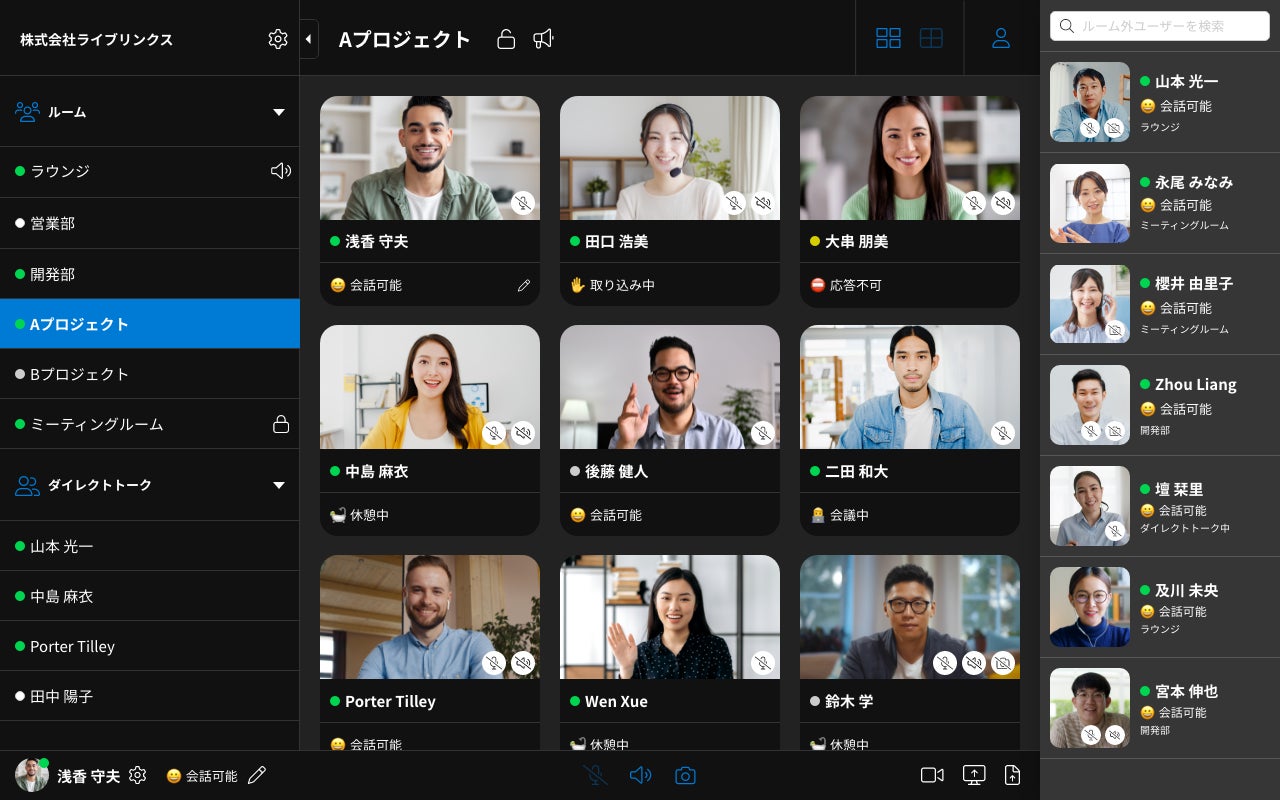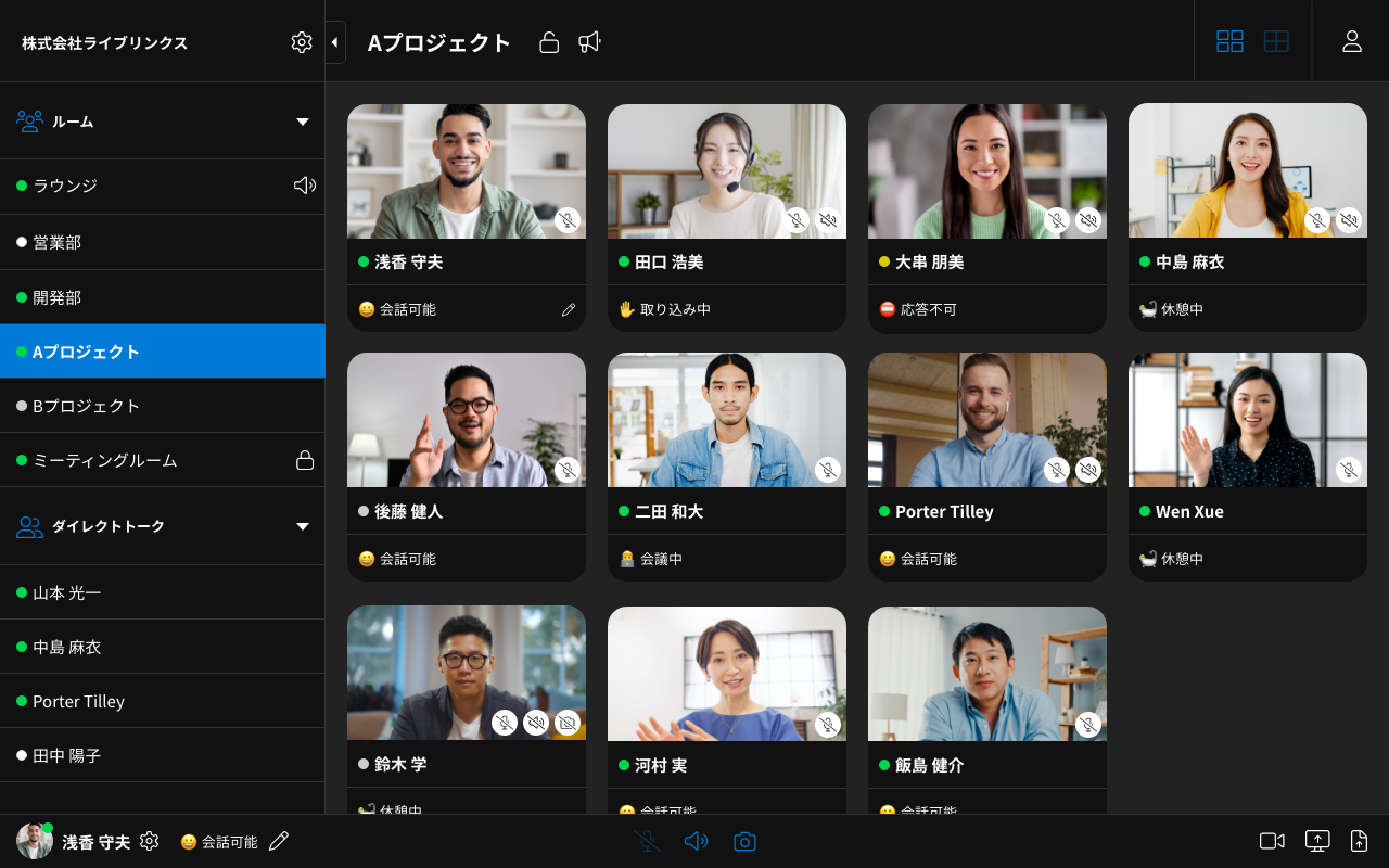 「LIVEWORK」は「リモートワークにオフィスの臨場感とチームの一体感を。」をコンセプトに、チームコラボレーションを促進するバーチャルオフィスツールです。「LIVEWORK」独自の「ワーカービュー機能」や「仮想ルーム機能」が、オフィスの自席から見えるいつもの光景・顔ぶれをオンライン上で再現します。また、「インスタントトーク機能」「画面共有機能」「プレゼンス機能」「ステータス機能」によって、オフィスでのリアルなコミュニケーションに引けを取らない、簡単でスピード感のあるコミュニケーションが可能になります。