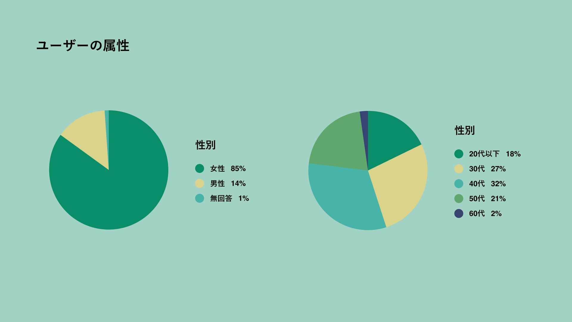 ユーザーの8割以上が女性の方で、年齢は20代から50代まで偏りがなく幅広い年齢層の方にご利用頂いております。
