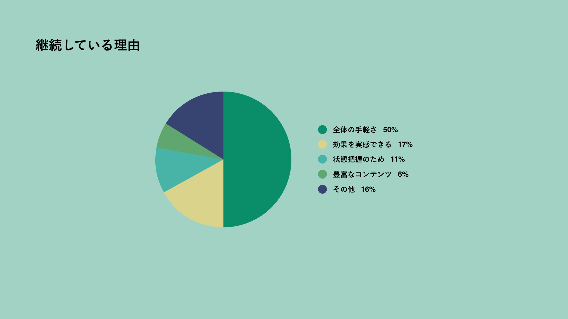 マインドフルネス・心のケアに未経験の方に多くご利用頂いておりますが、未経験の方でも継続がしやすい主な理由として、全体の手軽さ(計測方法の簡易さや、短い瞑想・ストレッチ・ヨガコンテンツによる手軽さ)によって継続しやすいと回答する方が約半数で、手軽にケアを実践しやすいという点を評価頂いている結果となりました。