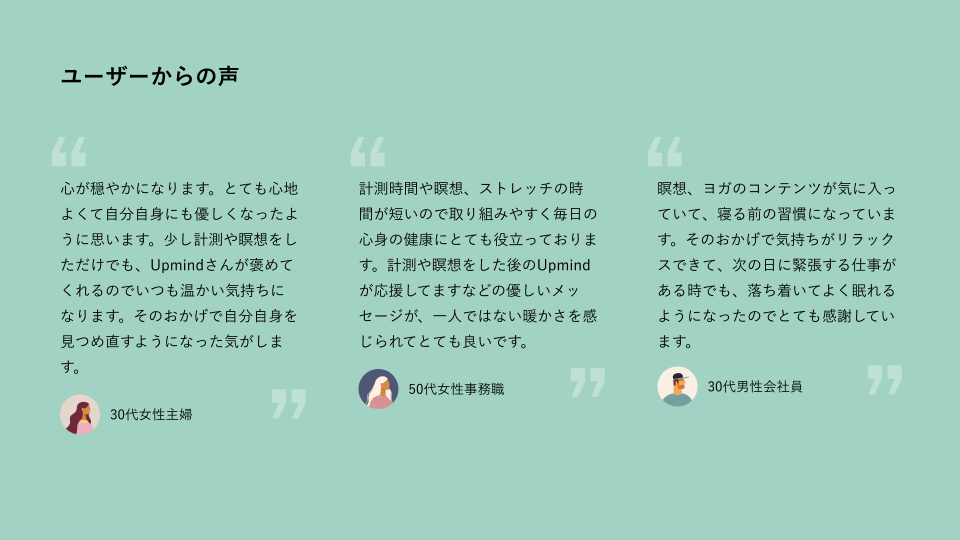 ととのうマインドフルネスアプリ「Upmind」を開発・運営(東京大学滝沢龍研究室とも共同研究)。「心が健康な社会の実現」を目指し、ウェルビーイング・メンタルヘルスの領域で事業展開を進めていくことを企画しております。