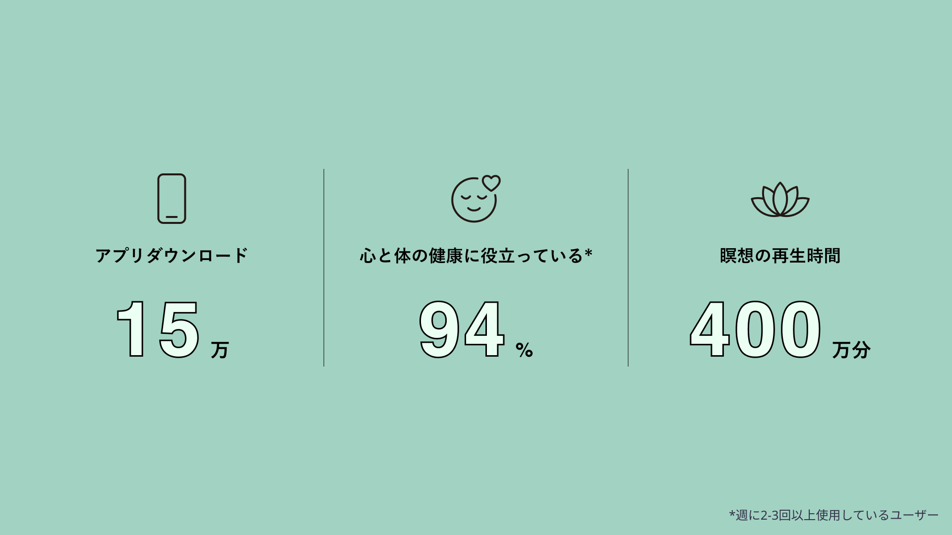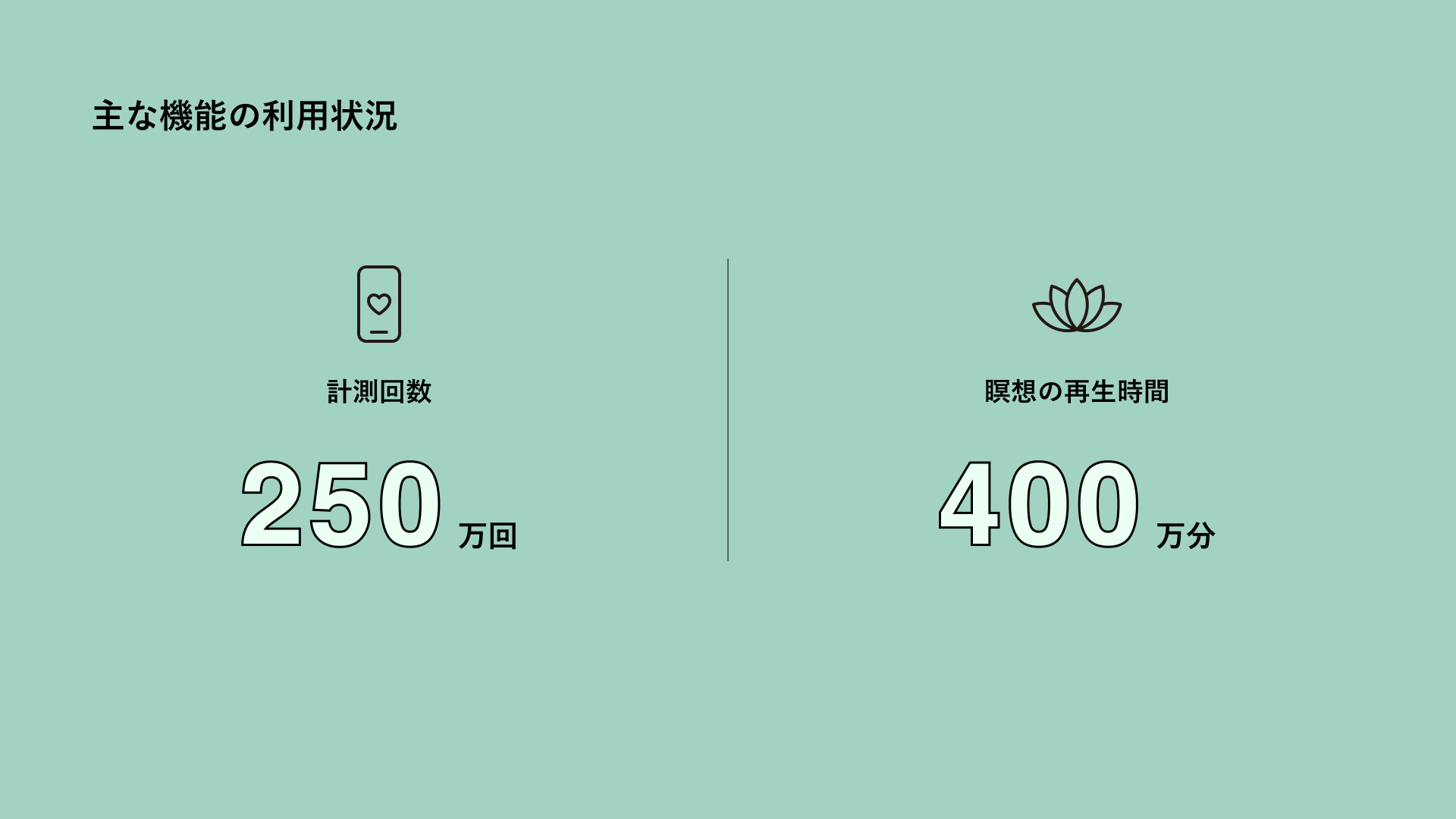 ユーザーの多くの方にご利用頂いている機能が心拍データの計測(自律神経の状態の見える化)と瞑想の音声ガイドの機能で、これまでに心拍データの計測がされた回数は約250万回、瞑想が再生された時間は約400万分(約7.5年分に相当)となりました。