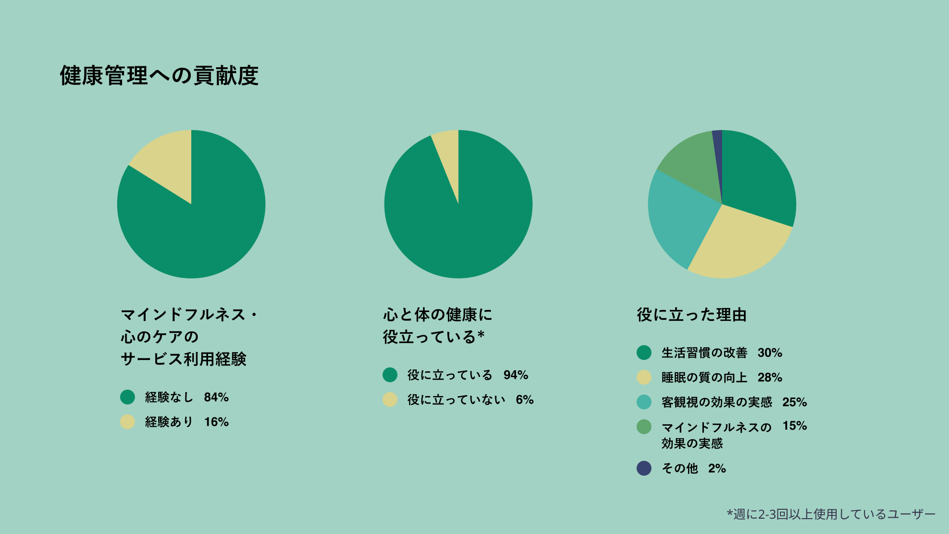 今までマインドフルネス・心のケアの経験がない方にも多く使って頂いており、ユーザーの8割以上が未経験の方となります。また、週に2-3回以上アプリを利用しているユーザーの94%が”心と体の健康に役立っている”と回答頂き、役に立っている理由としては、自身の状態の把握が生活習慣を見直す/ 行動変容のきっかけになった、睡眠の質が向上した、計測による客観視で安心感を得た/ より自身の体調が分かった、とのご回答が、その内3割程度ずつと最も多い結果となりました。