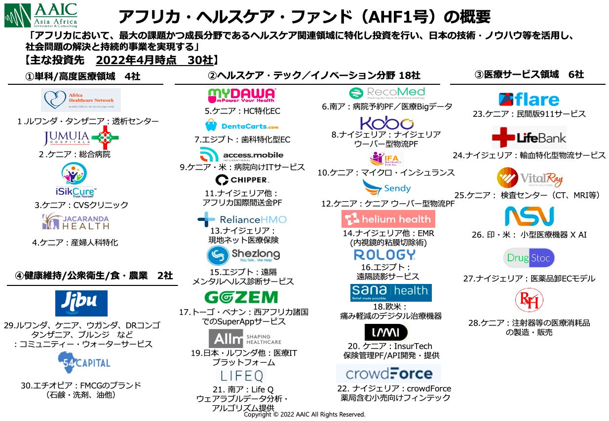 AAIC Investment Pte. Ltd. (本社:シンガポール、CEO:椿 進、以下 AAIC Investment)は2017年に日本初のアフリカファンド(Africa Healthcare Fund/AHF1号)を立ち上げ、47百万USドル(約58億円 *2)を調達し、SDGsの一つでもある、ヘルスケアセクターを中心に現在までに30社の企業へ出資・成長支援を行ってきました。