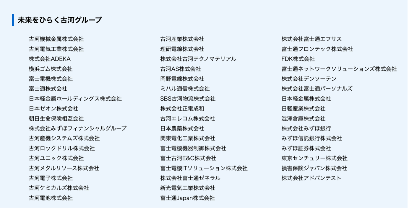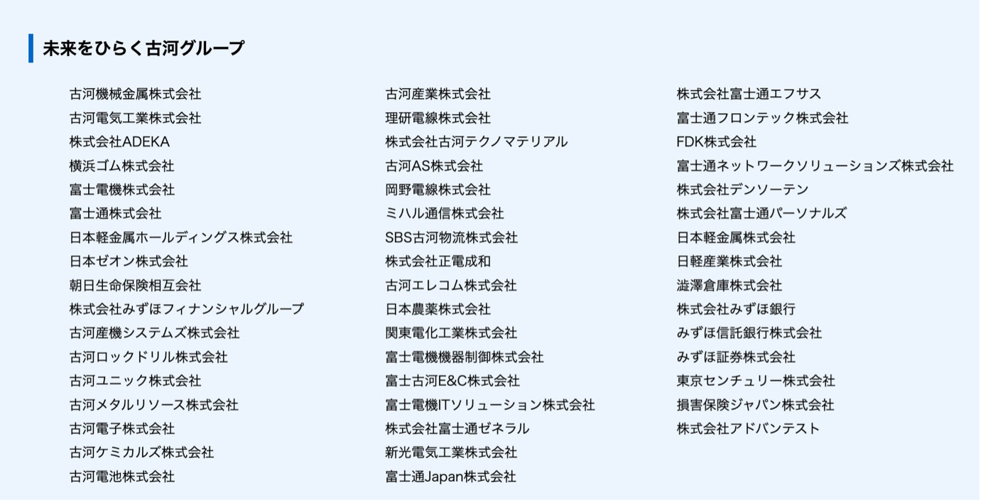 足尾銅山を拠点とした産銅事業の開始からすでに140年以上。現在では古河機械金属、古河電気工業、富士通、横浜ゴム、みずほ銀行などの他、国内の直列・関係会社を含めると484社、従業員数は33万人を超える一大企業グループを形成しています。