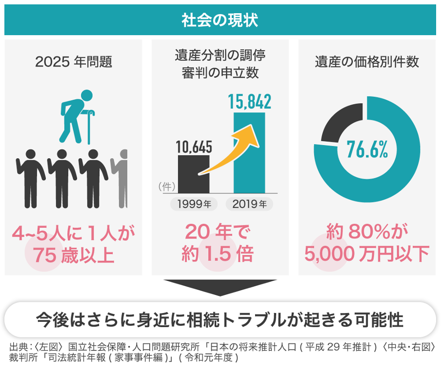 また、近年相続対策をしなかったことによる遺産分割のトラブルも急増しており、1999年から2019年までの20年間で遺産分割における調停審判の申立数は約1.5倍(司法統計年報・家事事件編令和元年度)となっております。