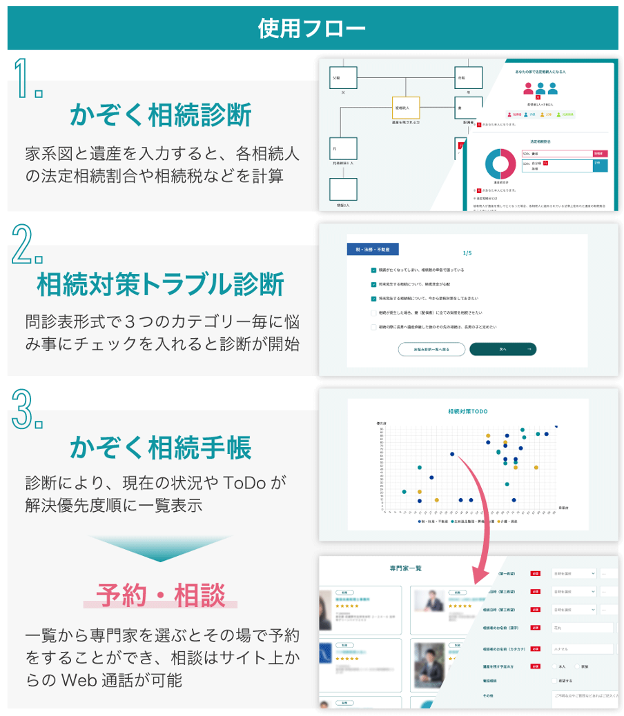 今回提供するサービスでは古河林業株式会社のHPサイトとして相続診断システムから導き出される問題点を提示し、その解決策について対応できる士業・専門家とオンライン相談が自宅にいながらさまざまな業種と行うことのできる無料相談システムの構築となります。
