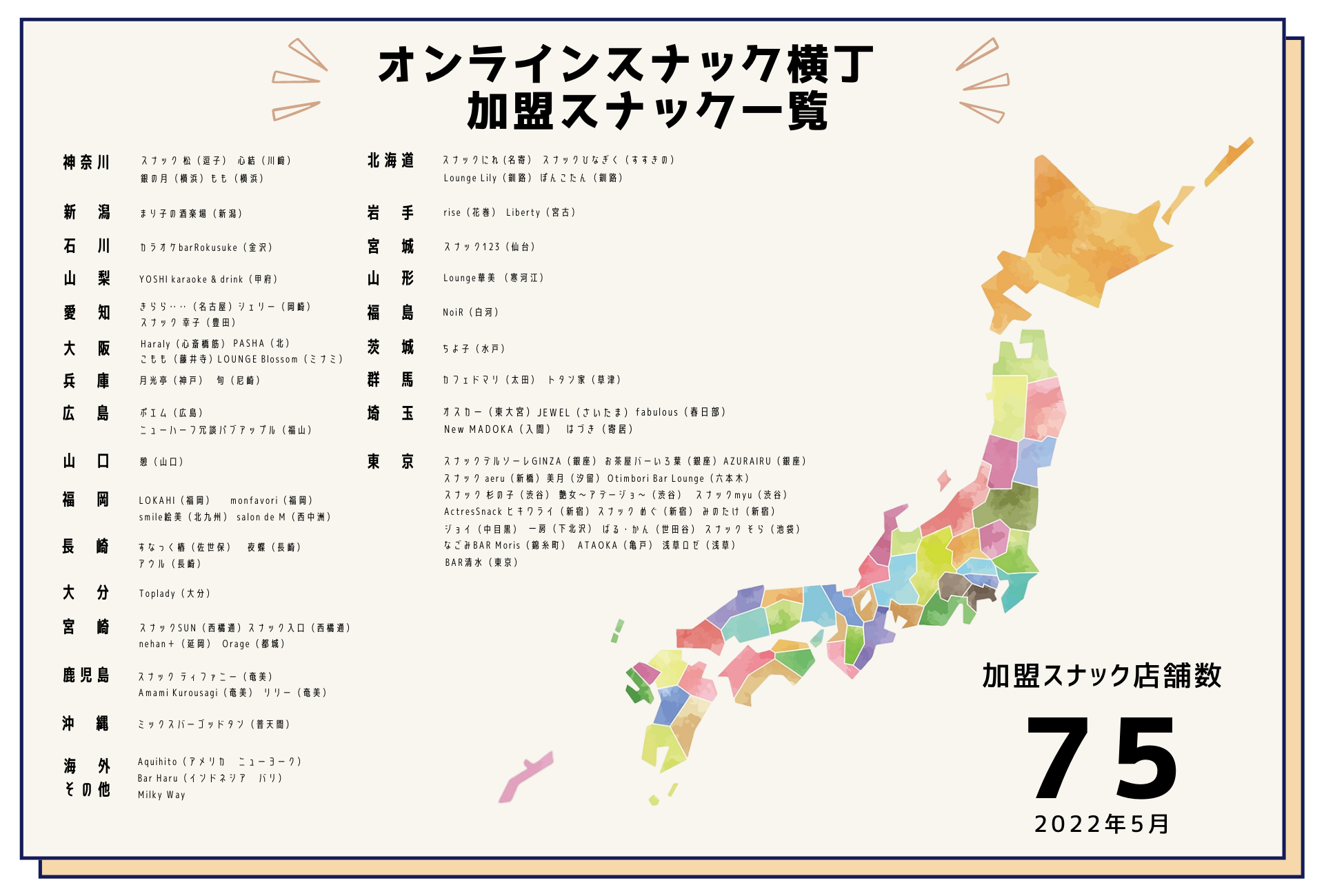 - 全国・世界のスナック75店が加盟する国内最大級オンラインスナックサービス「オンラインスナック横丁」