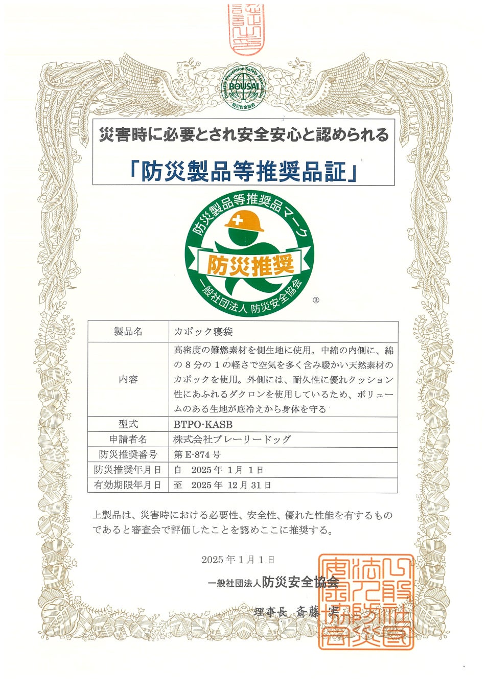 株式会社プレーリードッグ(大阪市中央区安土町3-4-16 船場オーセンビル7F 電話:06-6263-5228 代表:松岡良幸)が企画、販売するカポックを使用した寝袋、「カポック寝袋」が一般社団法人 防災安全協会より「防災製品等推薦品」に認定されました。