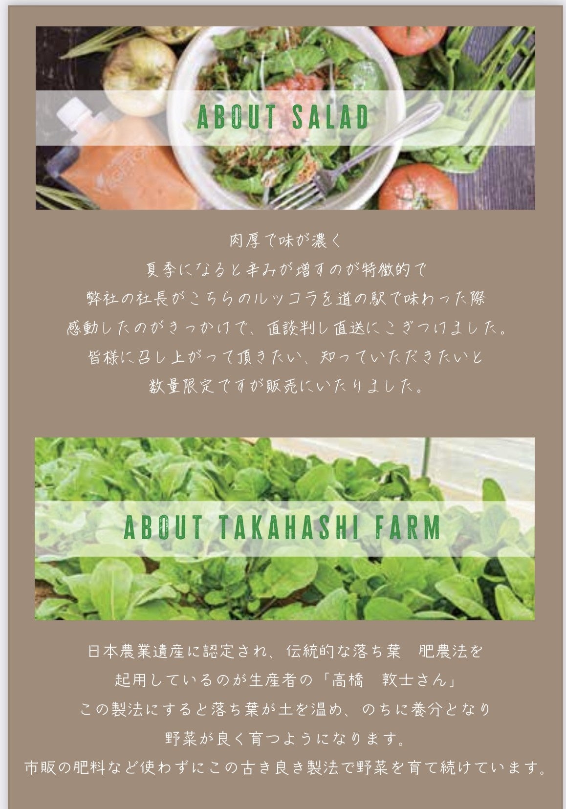埼玉県入間郡三芳町にある高橋農園さんのルッコラを、弊社の社長が頂いた際に感動し、猛アプローチの末コラボが実現されました。