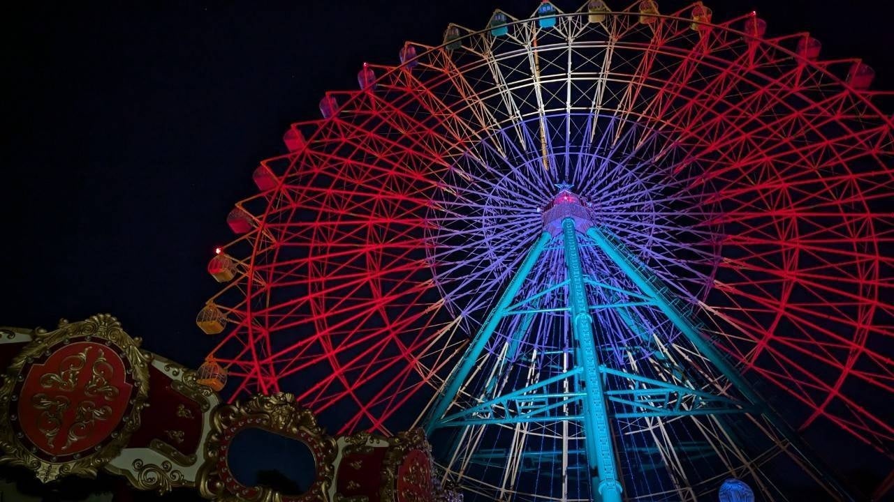 群馬県伊勢崎市のAuto Mirai 華蔵寺遊園地にて、大観覧車がペルー国旗の赤・白・赤にライトアップされました。