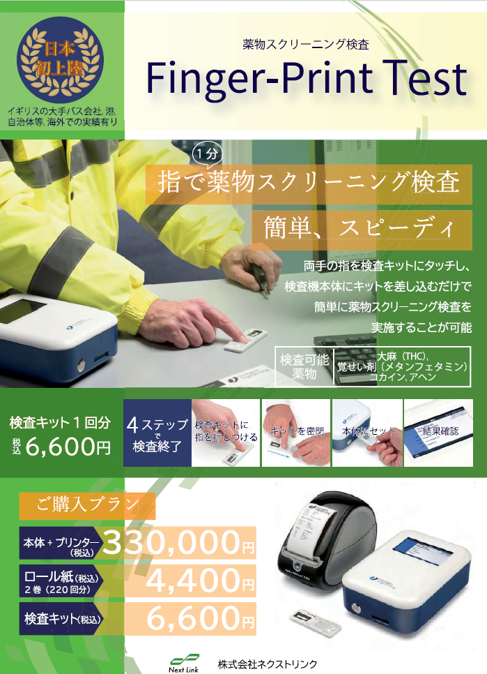 日本初上陸!いつでもどこでも、指で検査キットを押すだけで、簡単に4種類の薬物スクリーニング検査ができる「Finger-Print Test」を1月から販売開始します。