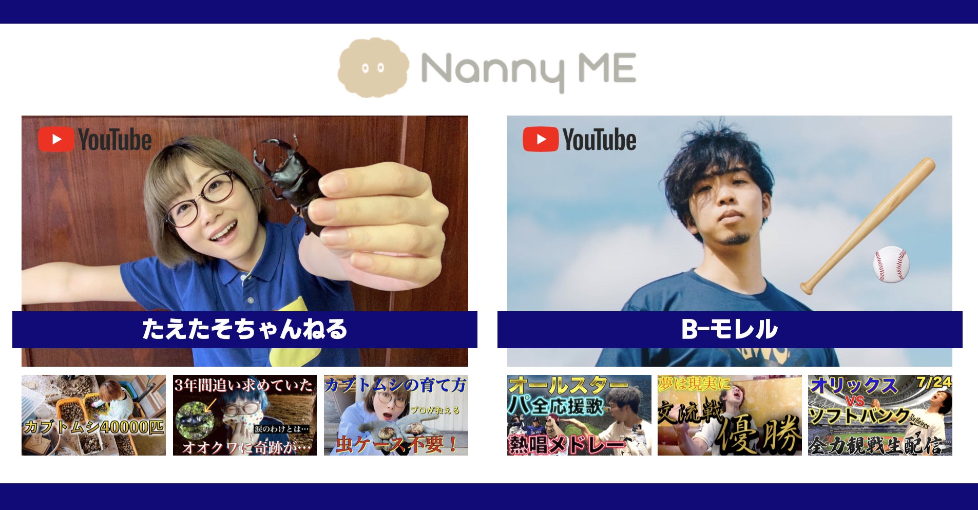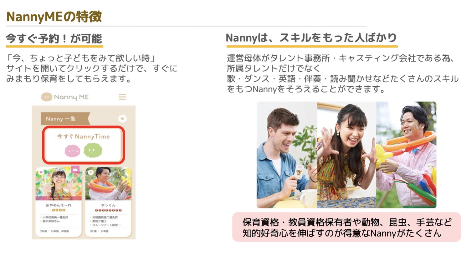 キッズ向けYouTubeにて、クワガタ・カブトムシの養殖場レポートや飼育方法が大注目の「たえたそちゃんねる」や、野球絶叫YouTuberとして大人気「B-モレル」、また韓国グルメ大食いYouTuberもNannyさんとして参加。メンバーには、YouTuberの他にも、歌手、ダンサー、保育士、うたのおねえさん、スーツアクター、お笑い芸人など様々なジャンルのこどもと遊ぶプロや、ヒーロー戦隊番組、魚釣り、世界各国事情、地域学、宇宙などの専門知識のプロまで、色とりどりの大人たちが、夏休みのこどもたちとオンラインと話すことを楽しみにしている。