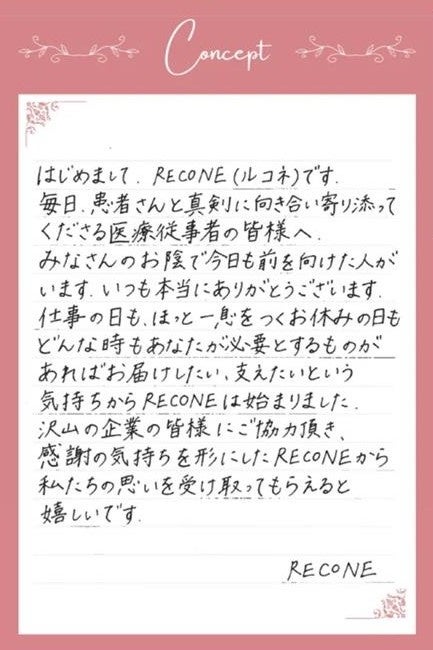 「RECONE(ルコネ)」はフランス語で「感謝」を意味する「reconnaissance(ルコネッサンス)」からの造語で、医療従事者の皆様に日頃の感謝の気持ちを込めた、医療従事者の皆様の毎日に寄り添い、心と体のゆとりを支えることを目的としたECサイトです。医療用品に限らず、生活雑貨やファッションアイテムを中心に、クローズドサイトならではの特別価格で幅広い商品をご提供いたします。また、販売による利益の一部は、医療関連団体への寄付を通じて、医療従事者全体への支援や入院中のこどもたちへの社会貢献などにも繋げてまいります。