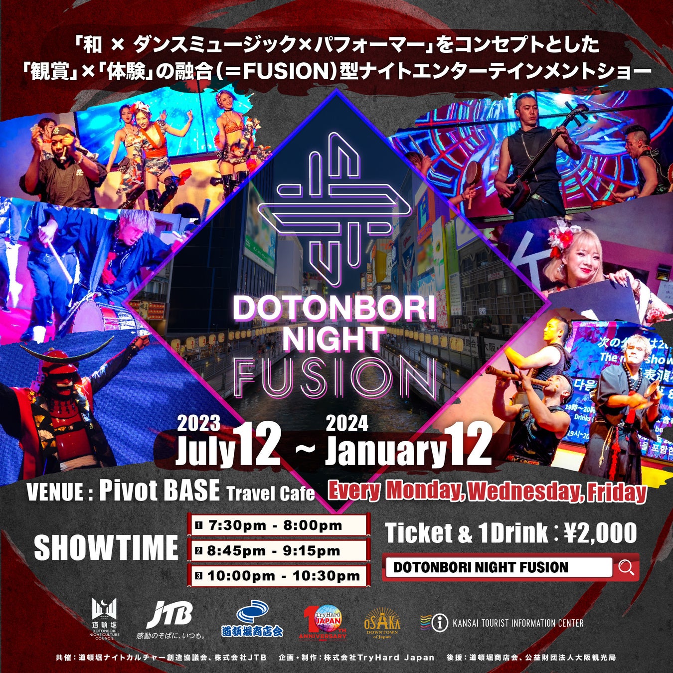 道頓堀ナイトカルチャ―創造協議会(※1)は株式会社JTBとともに、大阪・道頓堀で訪日外国人旅行者や国内観光客が大阪の夜を楽しむことができる観光コンテンツとして、日本の文化・芸能を体感できるナイトエンターテインメントショー『DOTONBORI NIGHT FUSION』を観光交流拠点「Pivot BASE ~Travel Café @Tonbori~(ピボット ベース ~トラベル カフェ アット トンボリ~)」で定期公演として2023年7月12日(水)より開催します。