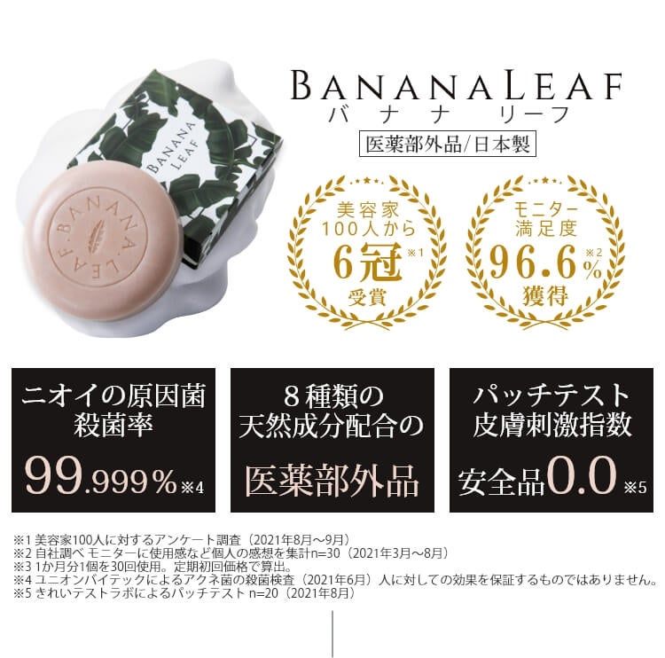 BANANA LEAFはニキビやワキガ・体臭に悩む女性に特化して作られた「医薬部外品ニキビ&体臭ケアせっけん」です。