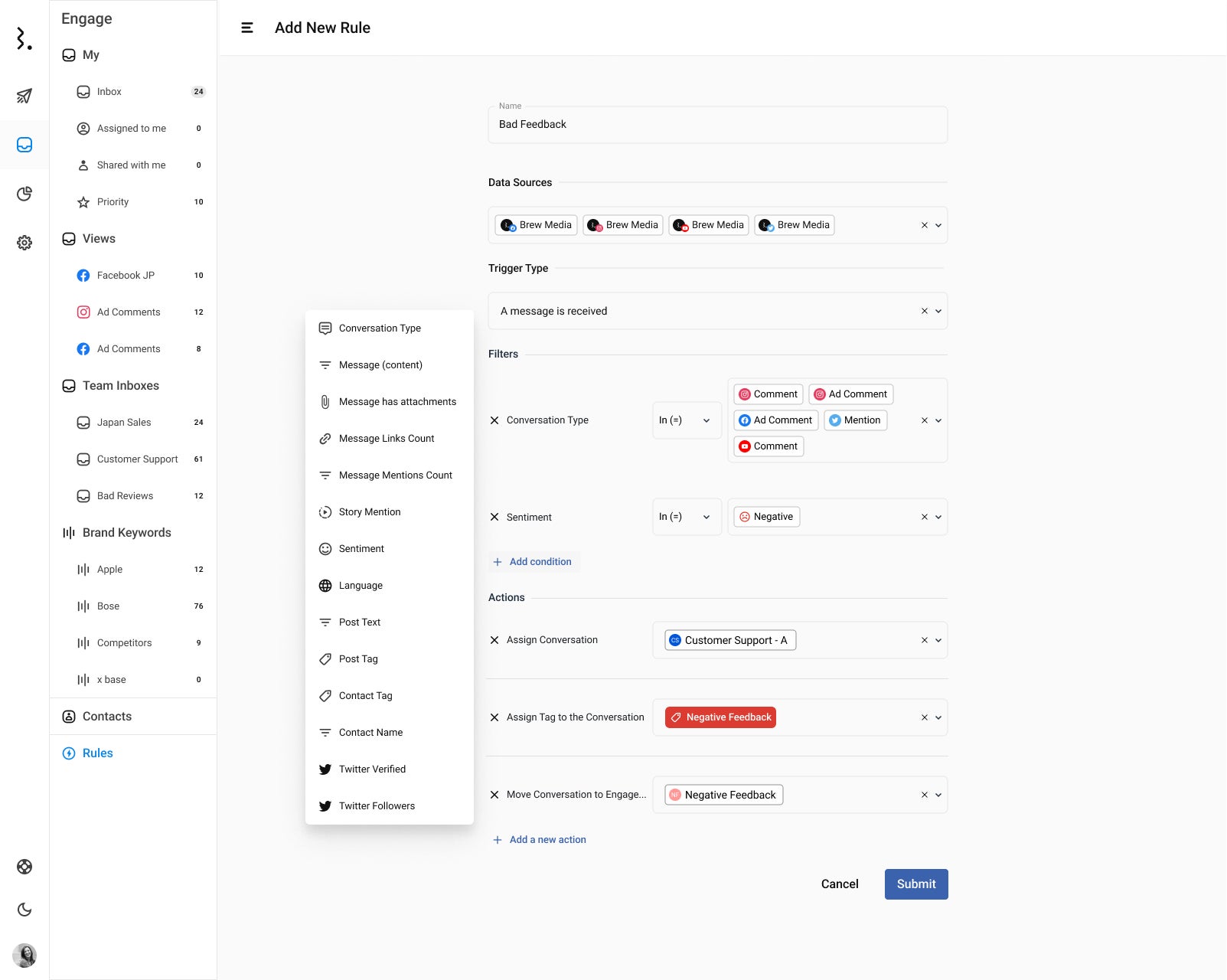 Statusbrewのルール・エンジンを使えば、指定した条件に基づいて会話を整理整頓、作業の優先順位をつけ、最初に対処すべき緊急事態があるかどうかを確認し、荒らしコメントやスパムを排除、すべての質問とメッセージに返信することが容易になります。