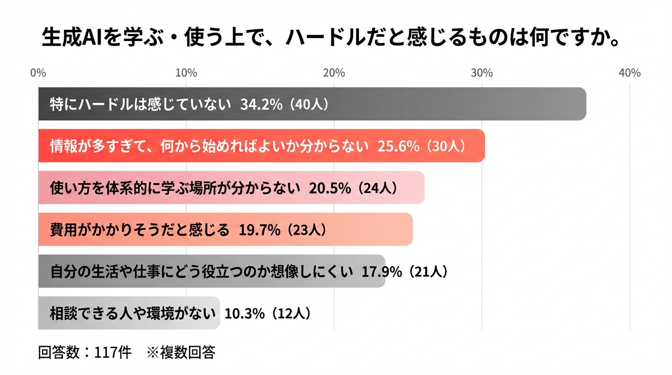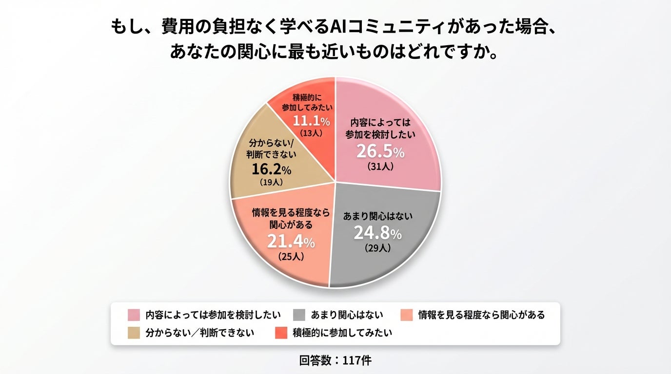 一方で、もし費用の負担なく学べるAIコミュニティがあった場合、「積極的に参加したい」(13人)と「内容によっては検討したい」(31人)を合わせた44人(37.6%)が参加を希望しており、誰もがアクセスできる学習環境への関心が一定程度存在することが示唆されました。