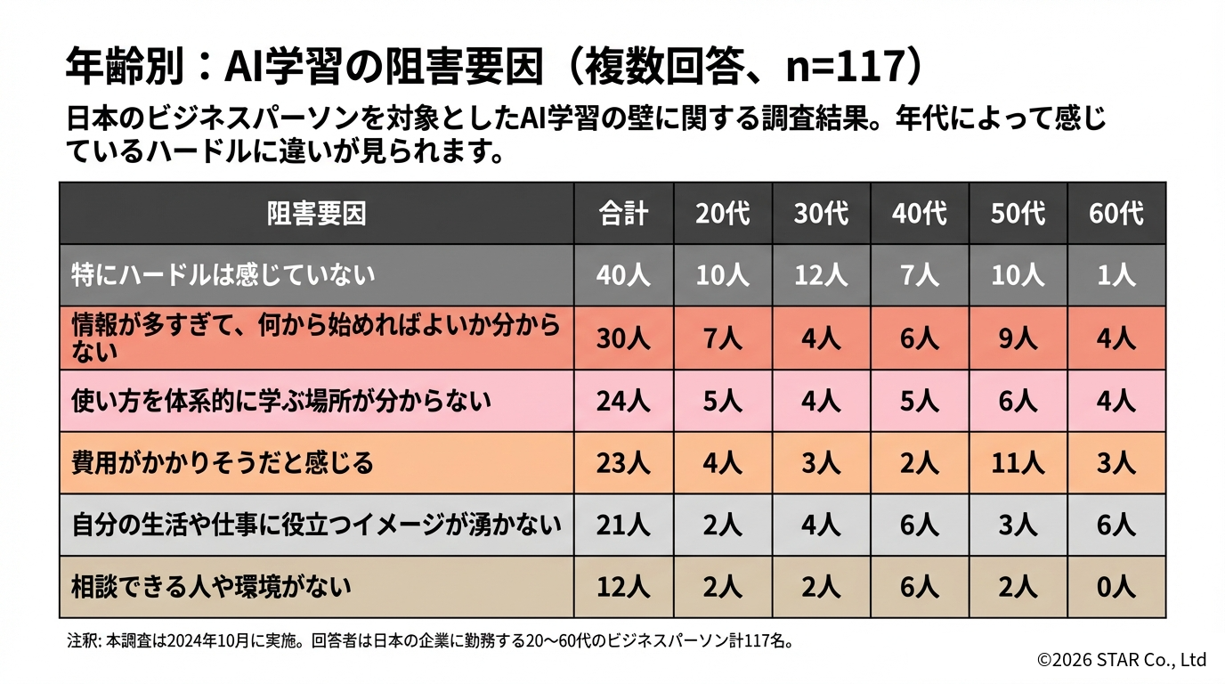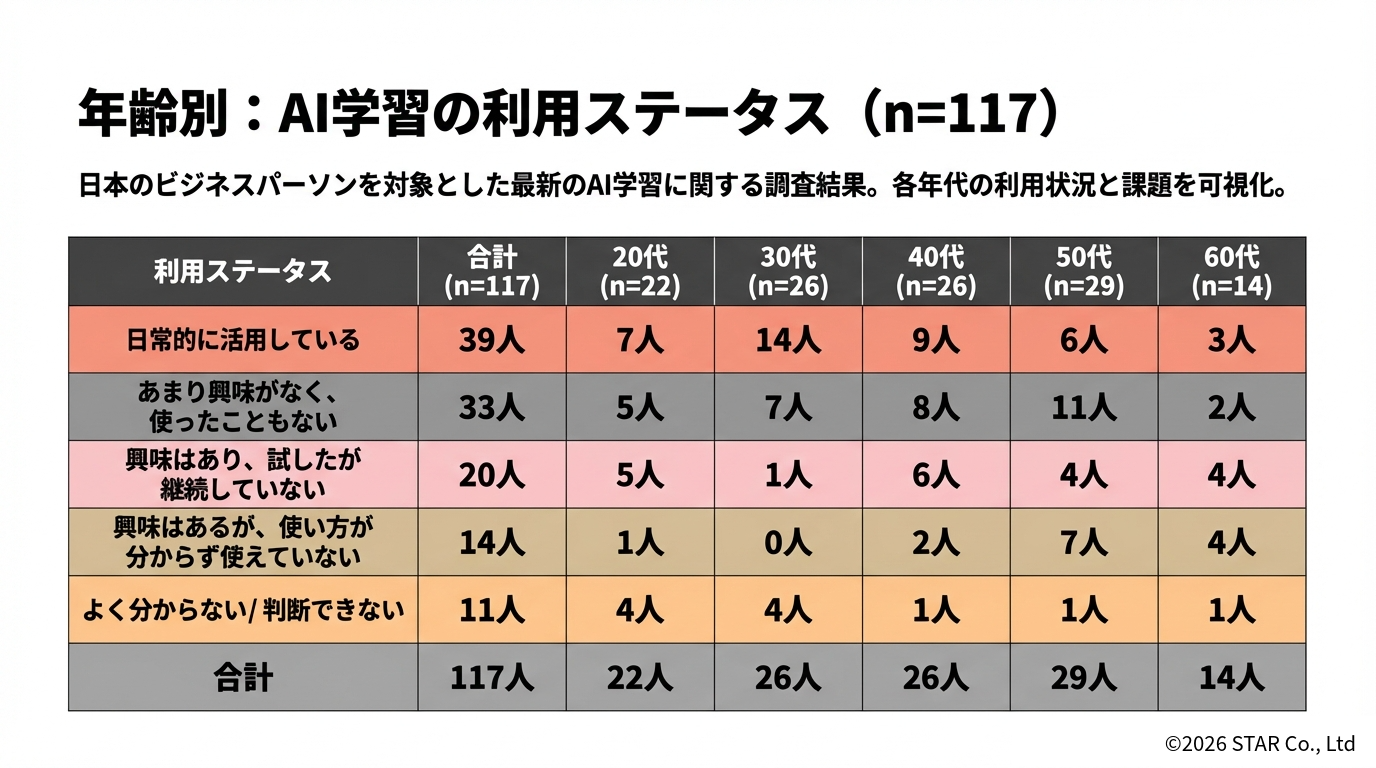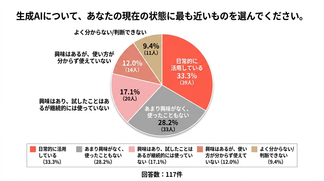 特に注目すべきは、「興味はあるが活用できていない層」(試したが継続していない層と使い方が分からない層の合計)が34人(29.1%)を占めるということです。この層はAIに対する学習意欲を潜在的に持ちながらも、適切な学習環境や継続性を担保する仕組みを欠いています。