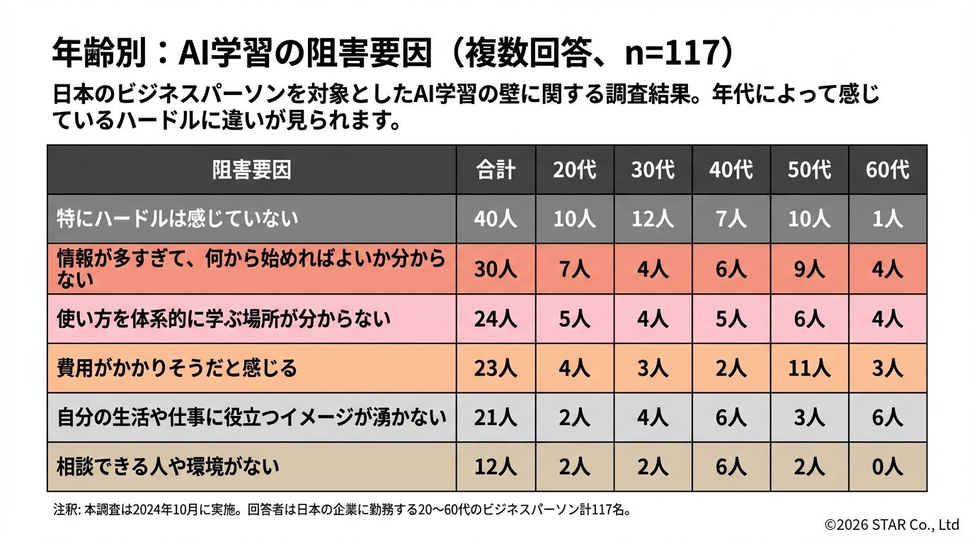 つまり、多くの人がAIについて「分からない」のではなく、むしろ「分かっていないことに気づいていない」という状態にある可能性があります。この認識のズレこそが、日本におけるAI普及を阻む真の障壁であり、従来の教育アプローチでは対応できない構造的な課題なのです