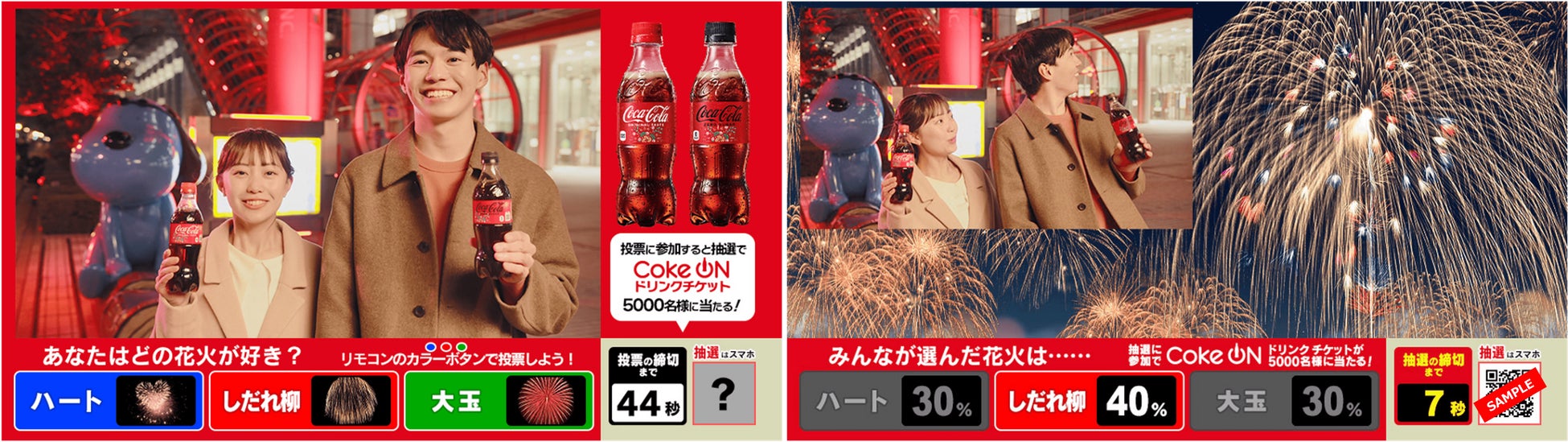 今回の日本コカ・コーラ株式会社の事例では、新年を迎えるワクワク感を一層盛り上げる花火のデザインをパッケージにあしらった「コカ・コーラ」“花火ボトル”のキャンペーンにあわせて、視聴者が見たい花火をデータ放送上で投票、一番多くの票が集まった花火がデータ放送上に打ちあがり、参加者には抽選で各日5,000名、3日間合計15,000名様にCoke ONドリンクチケットがあたります。