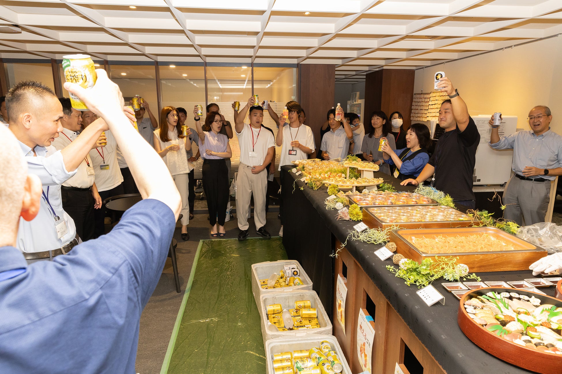 夕方からは、ケータリングコーナーにおつまみ風ピンチョスやお寿司、たくさんのお酒を用意して、暑気払いを兼ねた“納涼祭”をおこないました!