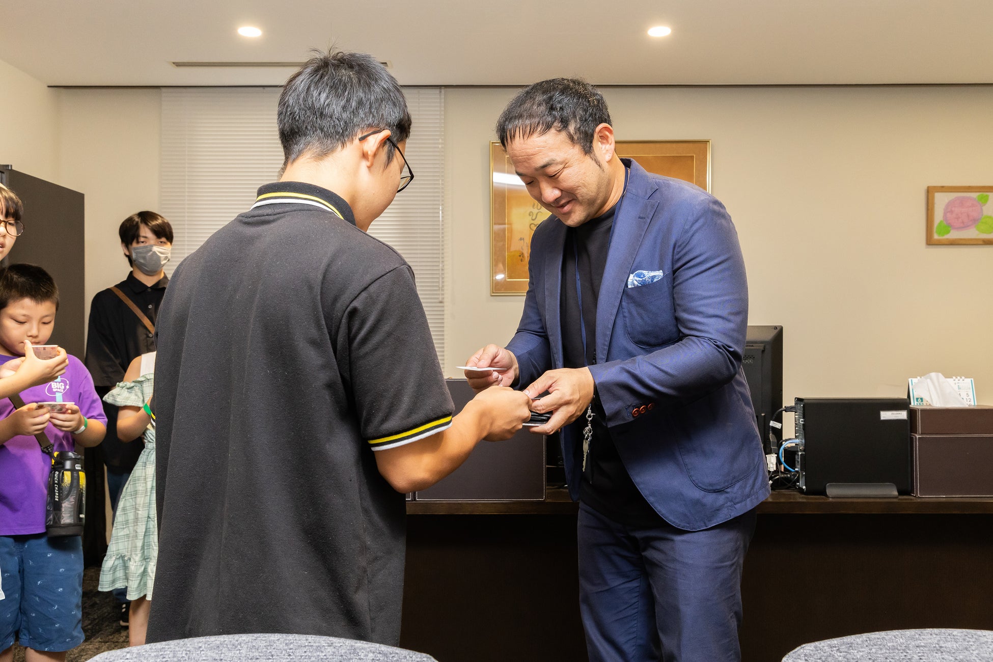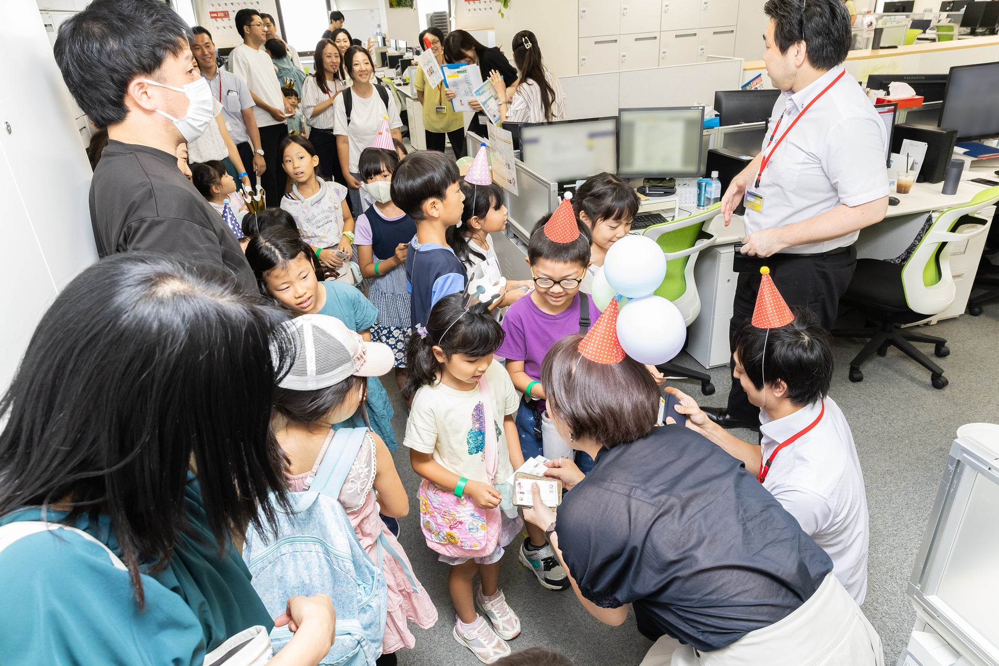 従業員の家族を含め、総勢350名が参加した「オープンオフィスデー」。メイン企画のオフィスツアーには35名の子供たちが参加。記念品のオリジナル名刺で実際に名刺を交換する体験がとても好評でした。