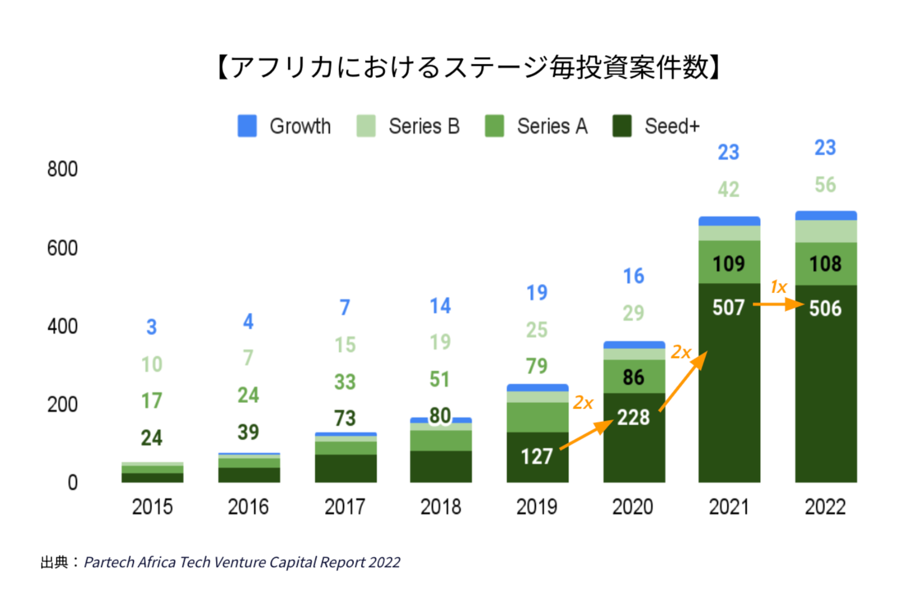 アフリカの過去のVC投資実績を見てみると、KAVがシード投資を開始した2019年からわずか4年間で同ラウンドの投資件数は約4倍に成長しています(左記)。