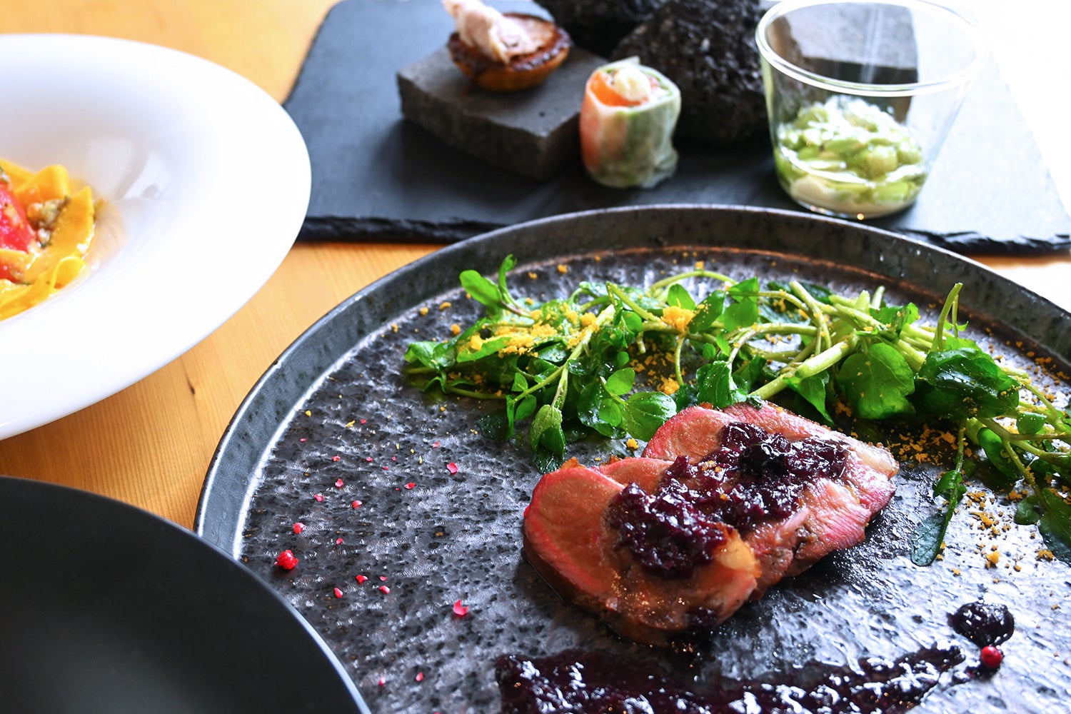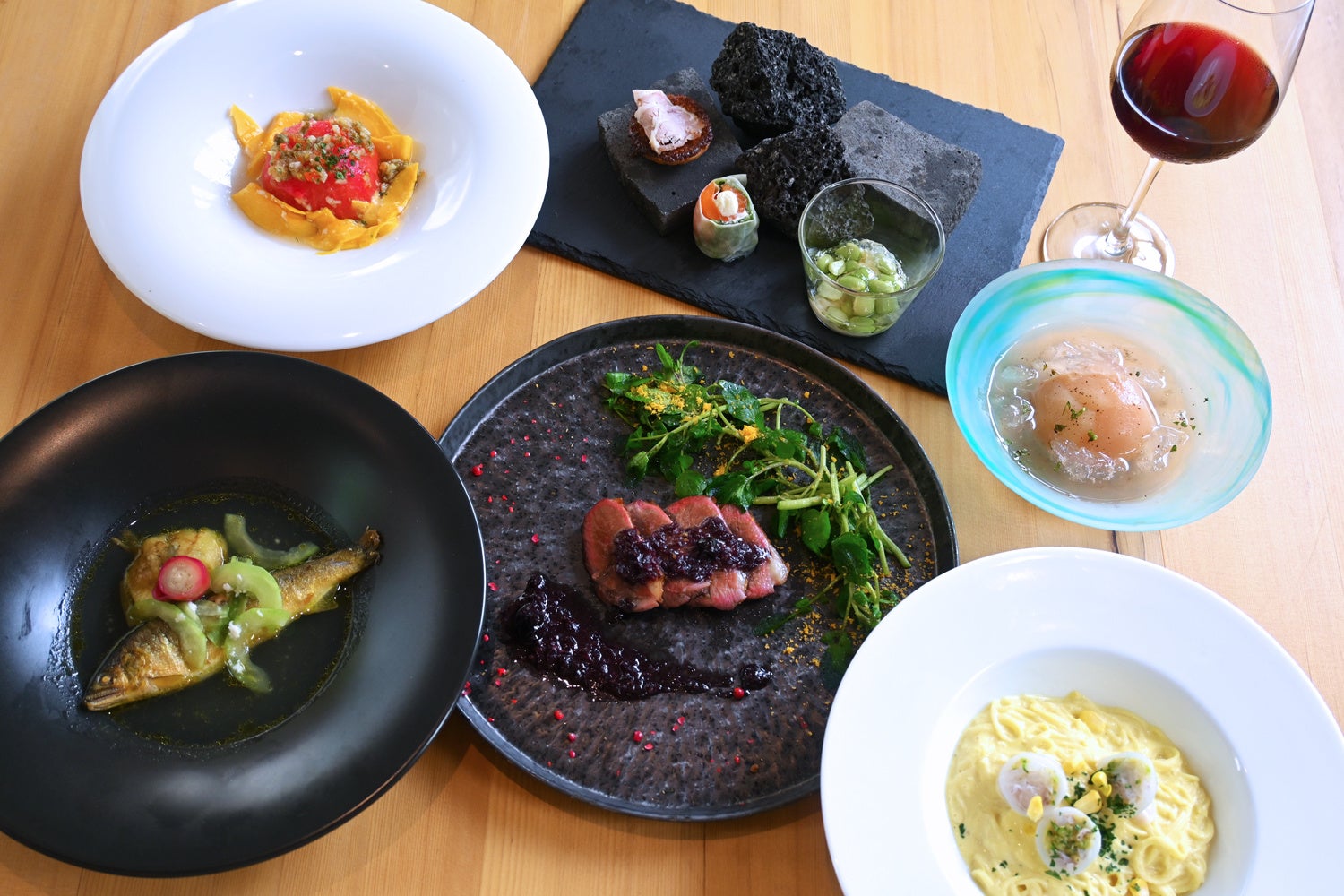 どのお皿にも必ず地元の食材を使用し、季節ごとの変化を五感で感じていただけるように工夫しています。山梨のワインから始まり、山梨県産の桃のコンポートで締めくくるコースは、料理を通じて富士山の麓を一周する旅のようなストーリーを描いています。