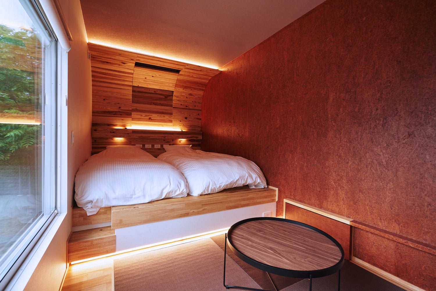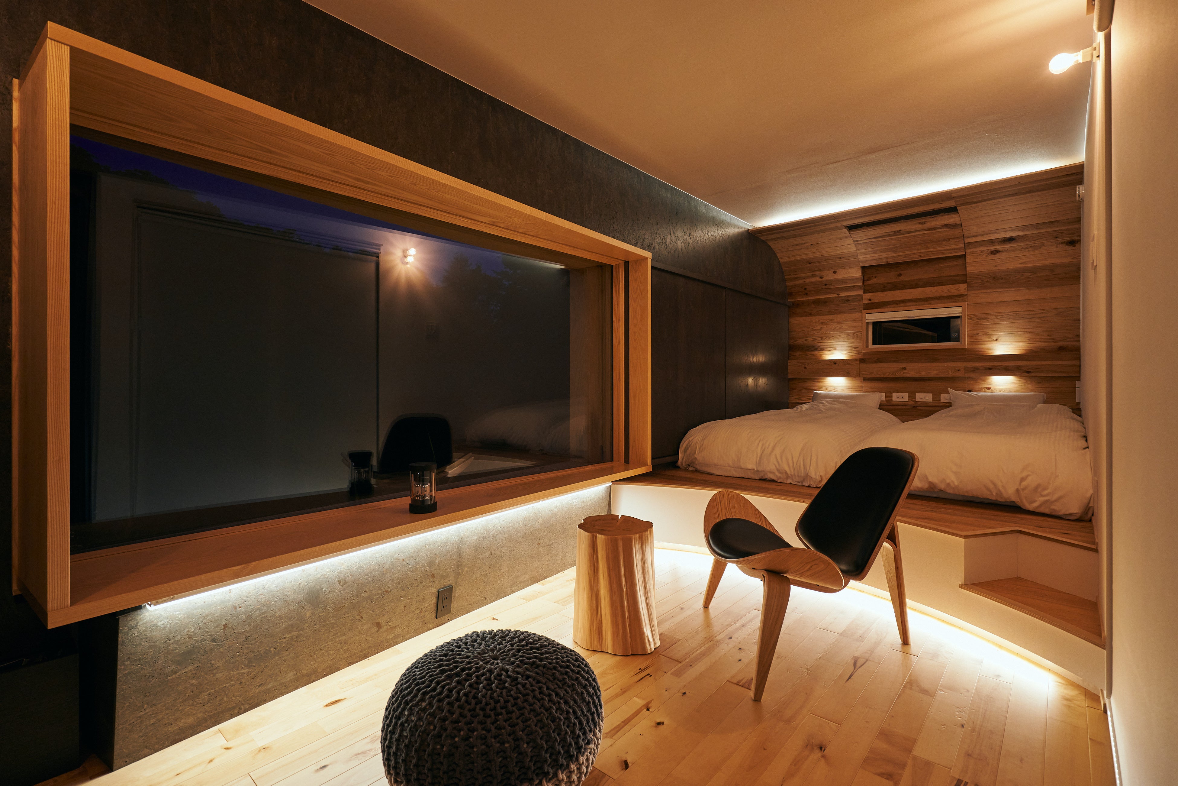 棟内設備:風呂トイレ、リビングスペース、デッキスペース、エアコン、ベッド