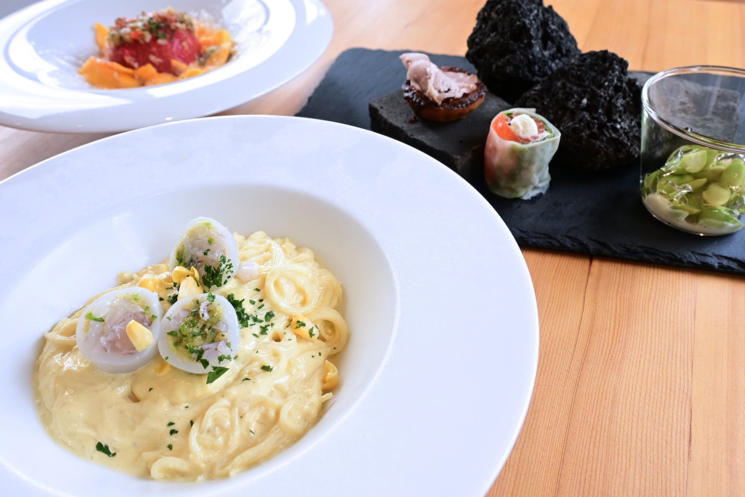 BLANC FUJIのレストランでは、富士山の麓を一周するようなストーリーをお料理を通じてお客様にお届けすることをコンセプトに季節のメニューを考案し、一皿ごとに特別なアクセントを与えています。どの料理にも地元の旬の食材を使用し、季節の変化を五感で楽しんでいただける工夫が施されています。