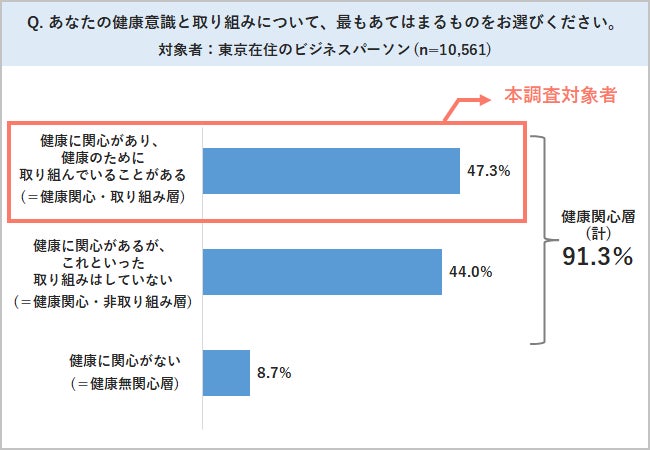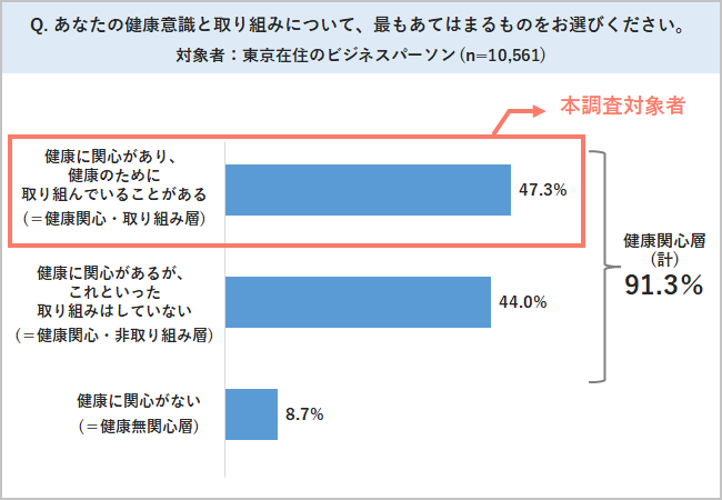 まず、「健康関心層」の割合は全体の91.3%と、非常に高いスコアを示しました。「健康関心・取り組み層」に絞ってみると47.3%と、約半数が健康維持・増進のために行動していることが明らかになりました!