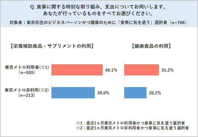 また、トップの「栄養補助食品・サプリメントの利用」に関して、東京メトロ利用者(n=555)では46.1%、東京メトロ非利用者(n=213)では39.0%と、直近1ヵ月のメトロ利用有無で差がつきました。同様に、「健康食品の利用」に関しても顕著な傾向が確認できました。お金をかけてでも健康的な食事を摂りたいという東京メトロ利用者の意識が見える結果となりました。