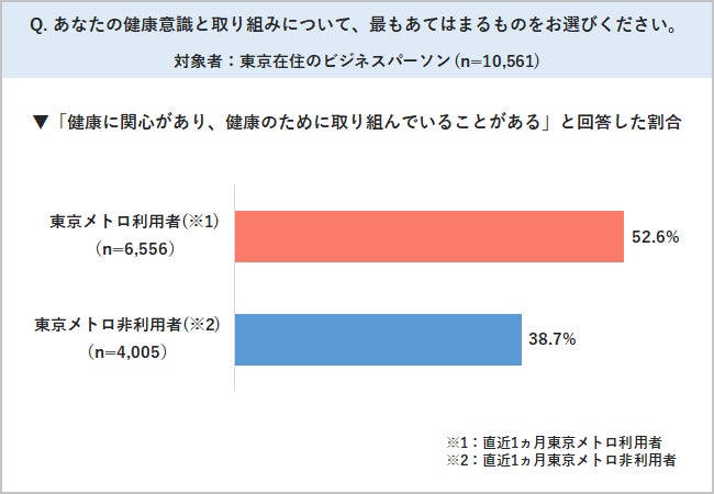 さらに、直近1ヵ月の東京メトロの利用有無で「健康関心・取り組み層」の割合を比較すると、東京メトロ利用者(n=6,556)では52.6%、東京メトロ非利用者(n=4,005)では38.7%と、大きく差がつきました。東京メトロ利用者の高い健康意識がうかがえますね。