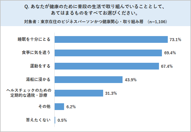 本調査では「健康関心・取り組み層」の中から1,106名を対象に、取り組み内容を確認しました。健康のために普段の生活で取り組んでいることとして最も多かったのは「睡眠を十分に取る(73.1%)」でした。以降、「食事に気を遣う(69.4%)」「運動をする(67.4%)」が続きました。