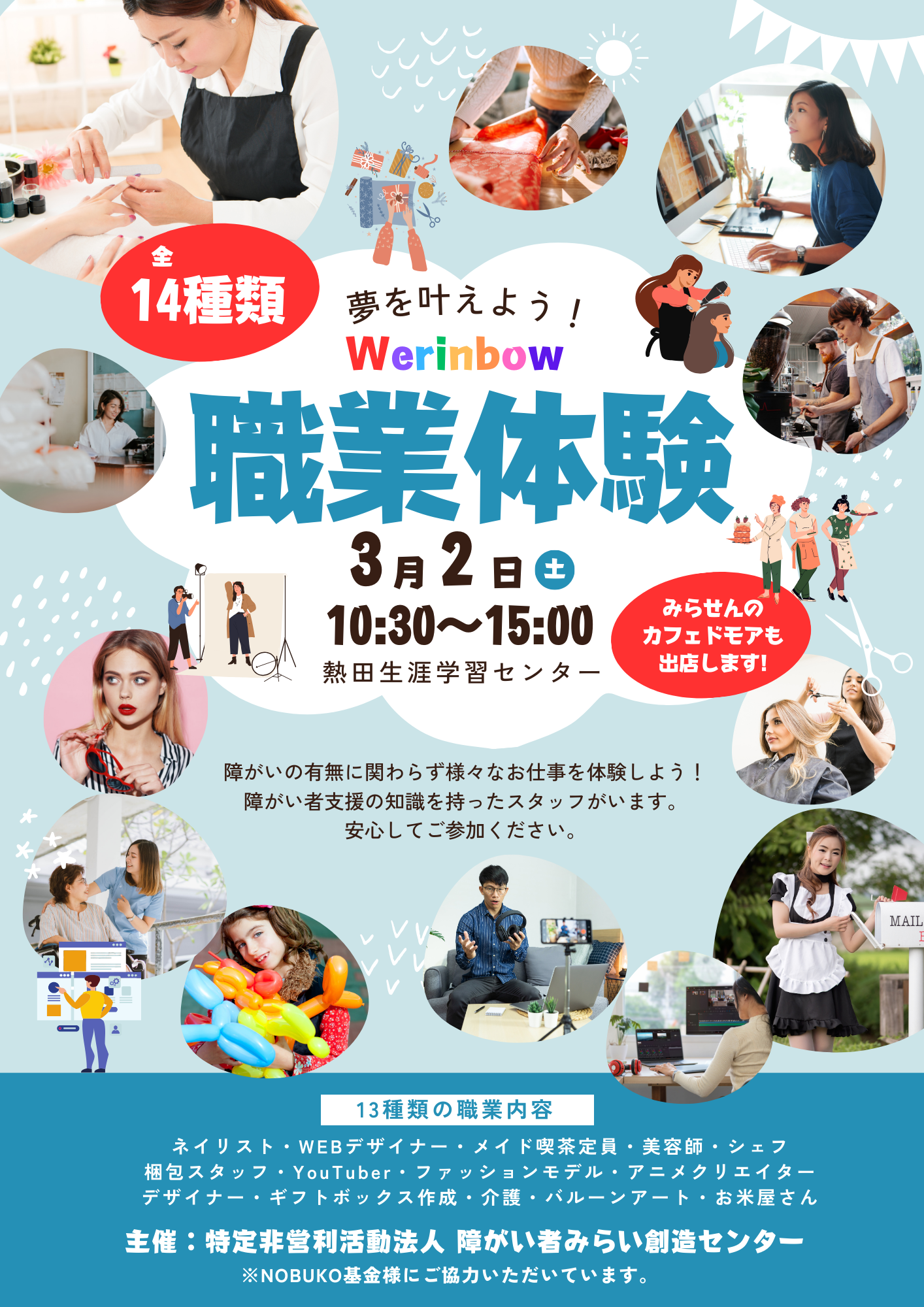 特定非営利活動法人障がい者みらい創造センター(本社:愛知県名古屋市南区、理事長竹内亜沙美)が運営する主に知的障がい・発達障がいがある中高生や若者を対象とした職業体験イベントを開催する『Werinbow(ウィリンボー)』が主催するイベントが開催され、愛知県内と東京の企業が協力し、障がい児者に職業体験を開催しました。